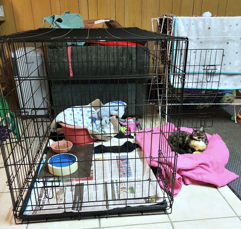 -a dog crate set up as shown in the photo, to act as her “home base”, where she will toilet (at this stage, she can’t manage a litter tray, but will return to her crate to toilet on puppy pads/newspaper), eat and sleep over night, if required. – a suitable crate will cost around $100