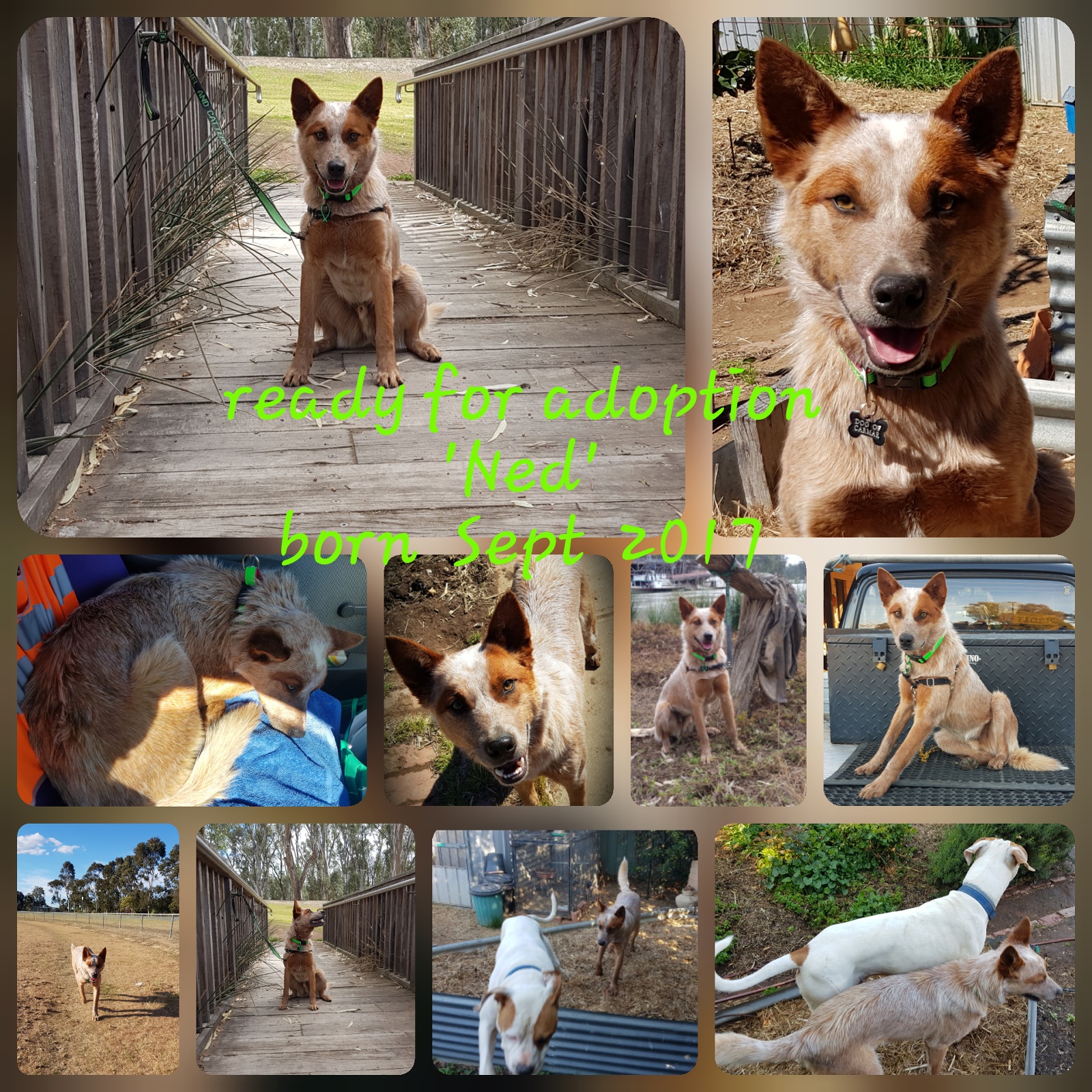 Ned travels well inside a car or on the back of a ute and is good amongst people walking down the street or at a market atmosphere.