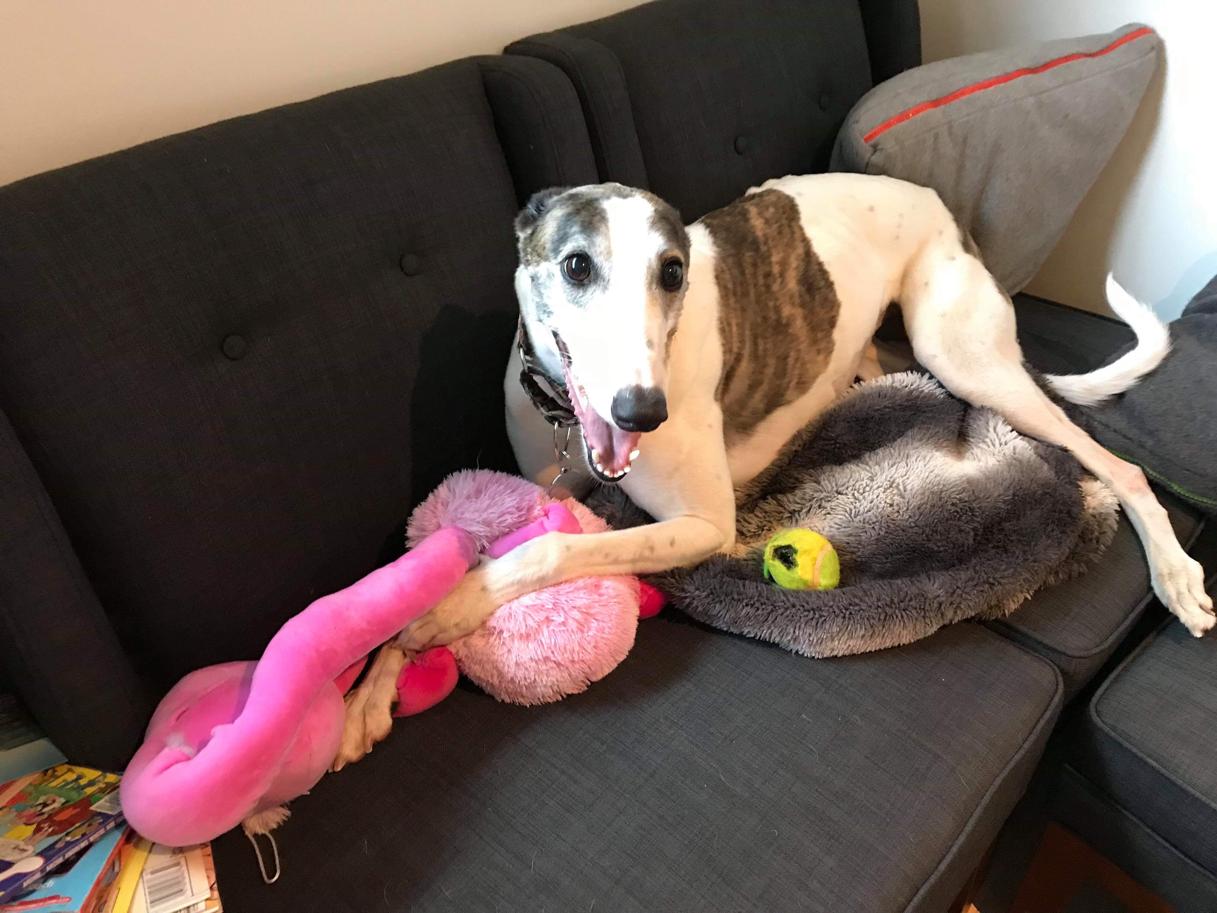 Charlee is enjoying foster care. She walks well on lead, she plays happily with other dogs, and is discovering the joys of sofas and toys.