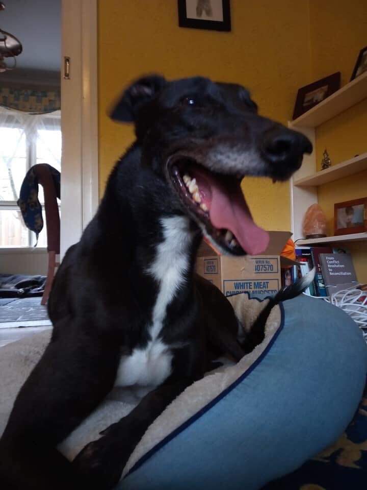 Damo thinks retirement is wonderful, and is going through a second puppyhood as he learns the joys of being a pet! The speckles of grey hair that he brings from his former life give him a distinguished look, even while he’s frolicking like a lunatic, or trying to turn himself into a pretzel.