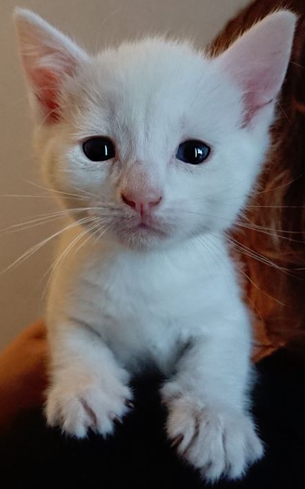 Hi I'm Polar Bear. I am the absolute smoochiest and sweetest little guy you could ever meet, who is always waiting to run and play or have snuggles and kisses with you. My siblings, Chase, Chess, Ember, Saffron, and I were born in foster care. Our Mumma Boo was a stray kitten who was brought into care heavily pregnant with 6 babies. She was only a kitten herself giving birth at 9 months of age. She gave birth to 3 of us at home and required an emergency cesarean to give birth to the rest of us (one baby, Winter unfortunately passed away at birth). I happily live in foster care with other cats/kittens, dogs and my big and little foster carers. I'm an affectionate, super playful (love to chase balls and will most likely play fetch as I get bigger) and cuddly kitten, who will make you smile non stop. I love to lay on your lap and have ear, chin and belly rubs. I am an absolute character and a very intelligent little man. I demand attention, trying to get to you however I can and cling on like a koala when in your arms. I am an INDOORS ONLY kitten (and being all white, I will need to be careful laying in the sun in windows and outdoor enclosures), but I love it best there because I feel safe and love being near my family. I will need a special home with someone who can give me lots of love, understanding, time and patience to adjust to a new environment and when settled I will give lots of love and kitty cuddles.