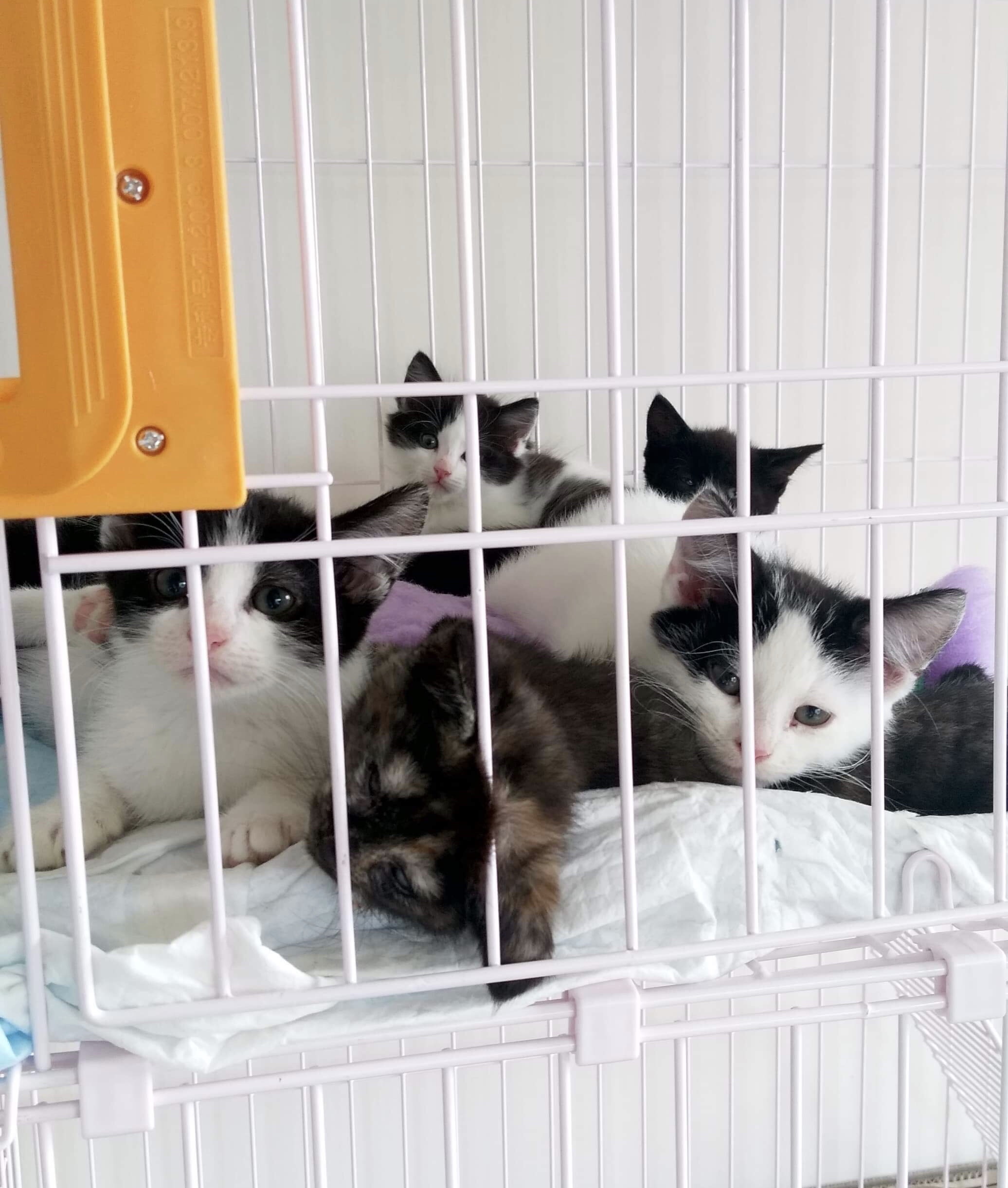 There are 2 panda 🐼 kittens, 2 black & white kittens and one tortie girl. They are approximately 9 weeks old and currently fostered at North Ryde.