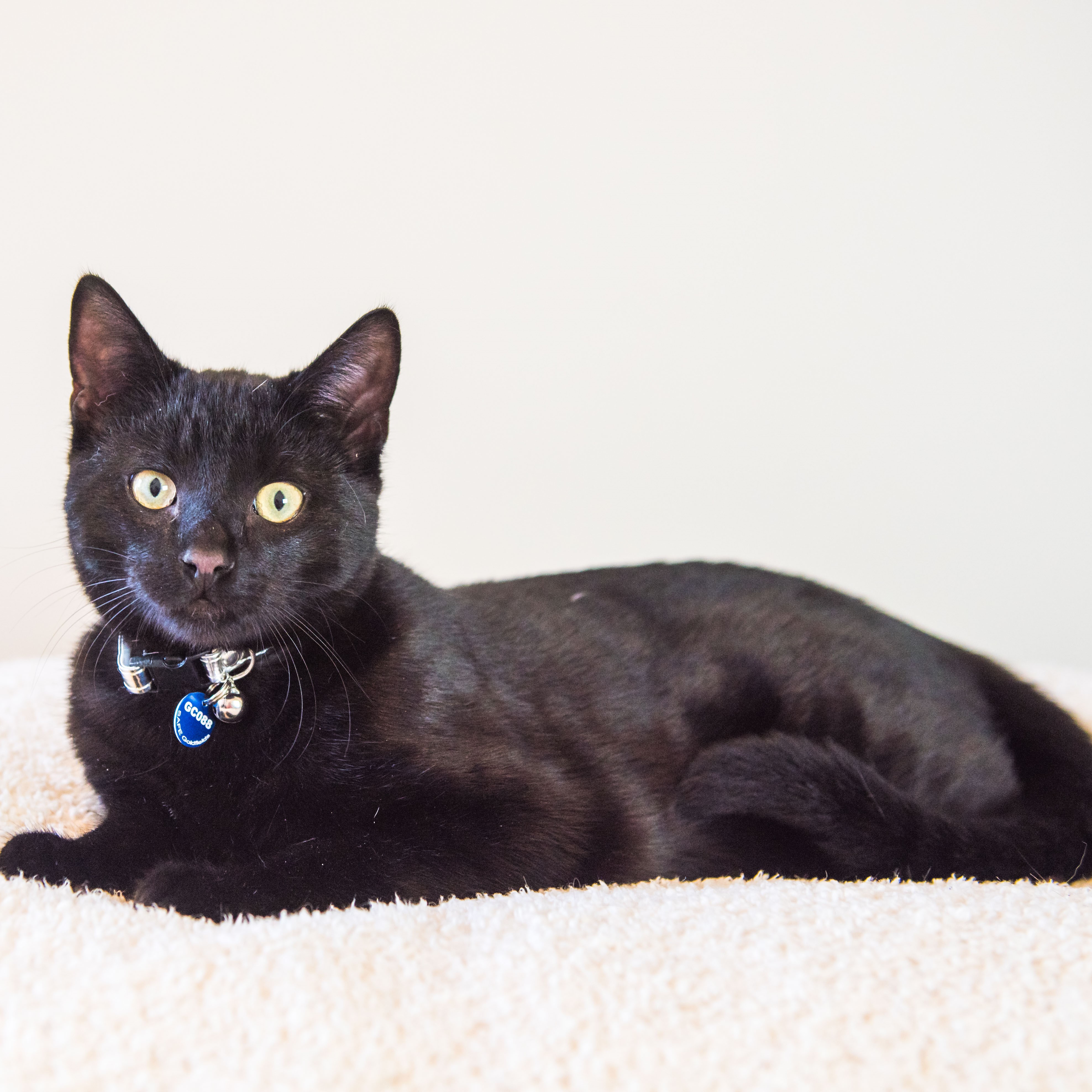 This sleek looking kitten is Boo. He is very aptly named as he loves to pop out of hiding and startle you. Boo enjoys curling up beside you on the bed and lounge for cuddles. He has one other funny trait, he loves playing with water. How can anyone resist those gorgeous eyes?