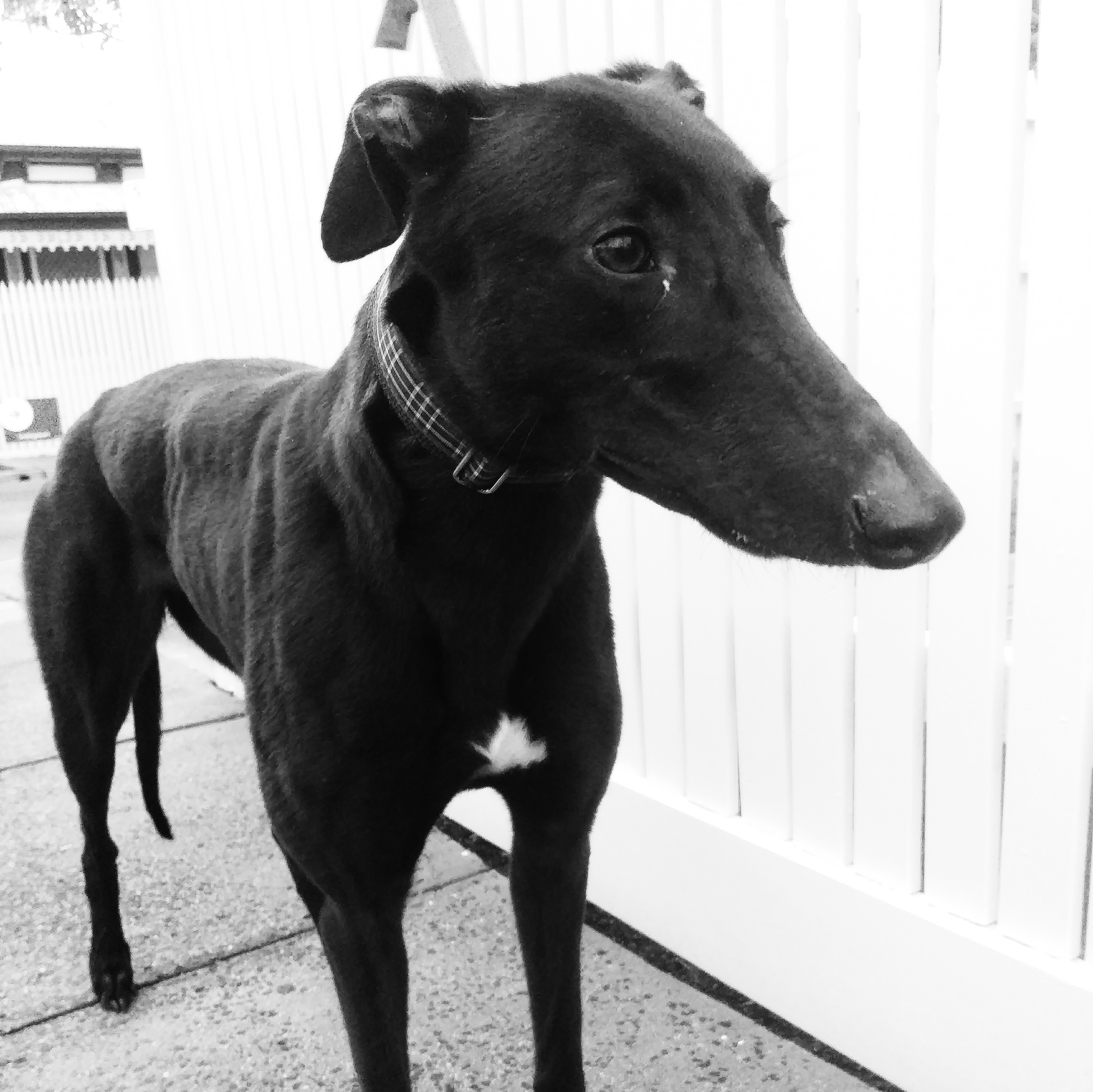 Ebony’s in foster care with another greyhound, and is fine while her people are at work, as long as she has canine company (she hasn’t tried being all by herself). She likes meeting all kinds of dogs on lead, but gets a bit excited if they’re running around having fun without her. Ebony has plenty of big-girl bounce, so isn’t suitable for homes with young children who might get knocked over. She has a big-girl appetite too, and is learning to wait nicely for her food (it’s so hard!), as well as other commands like “stay” and “on your bed”.