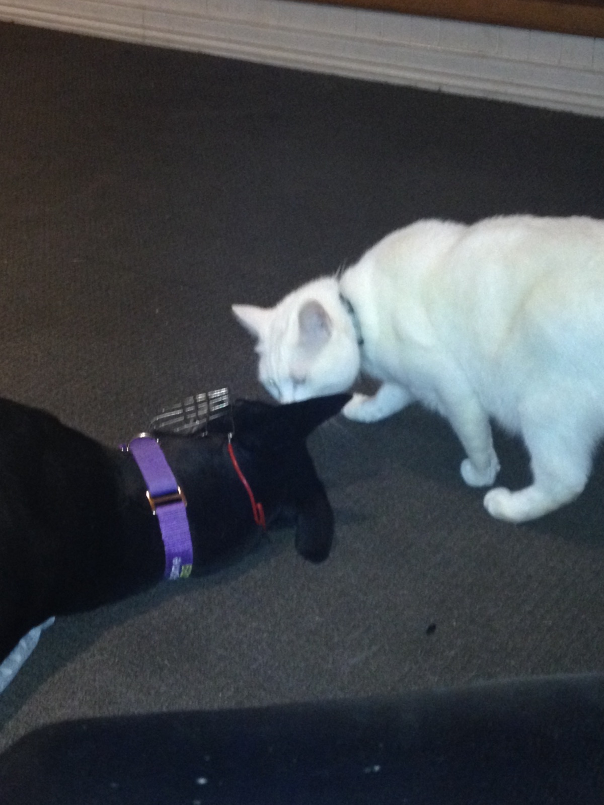 Not only is Angel living with cats in her foster home but she has been positively been exposed to sheep horses and chooks as well.