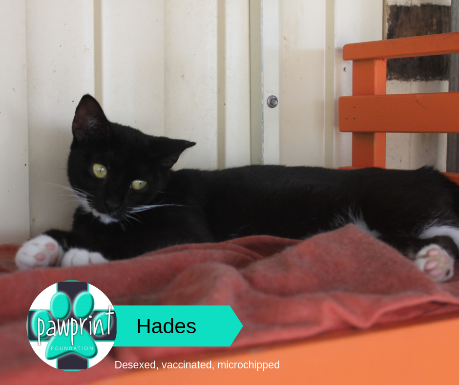 Hi I’m Hades, I had a rough start, I hated people when I come to my foster carer but my best friend Hera seemed to like her so I made her wait a long time, but every time I turned around she was there so I slowly started letting her pat me and wow who knew I love being rubbed under the chin, I come out now just to get loves. I am still quiet compared to some cats but I love to play with laser light, I’ll chase it all day, I’ll probably hide once you first meet me but I do trust quickly and can be your best mate given the chance .