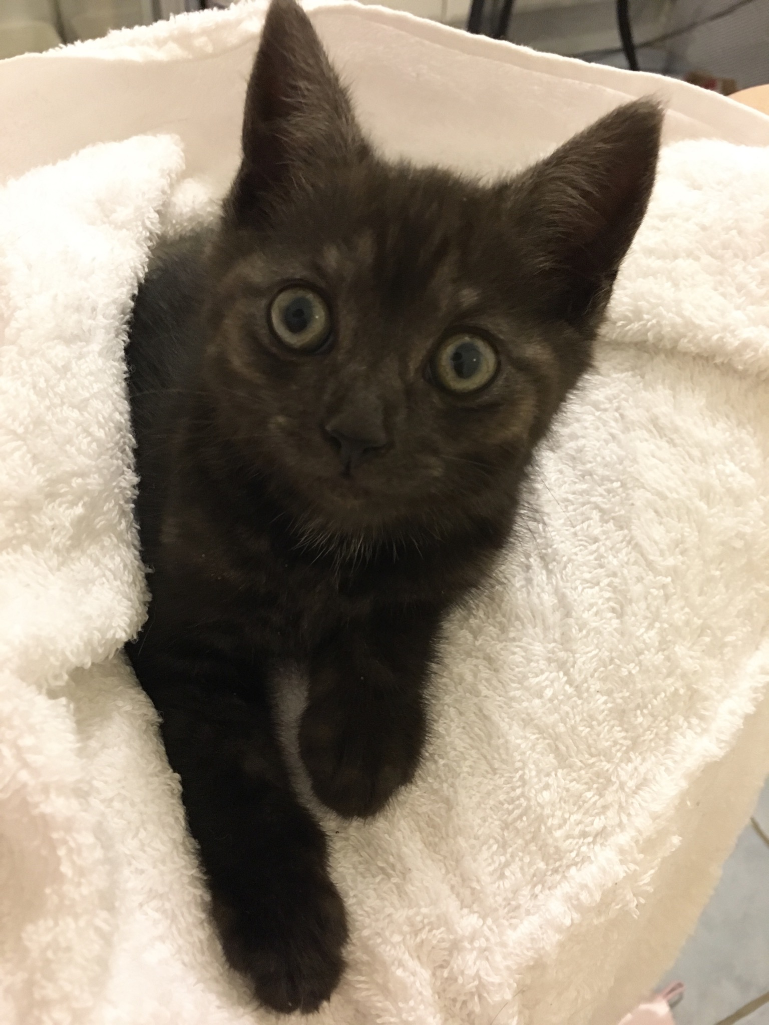 Stunning smoke black kitten Sooty was rescued last week from a depressing construction site. Although only rescued and in foster care with us for a short while, the little boy is already cuddly and affectionate.
