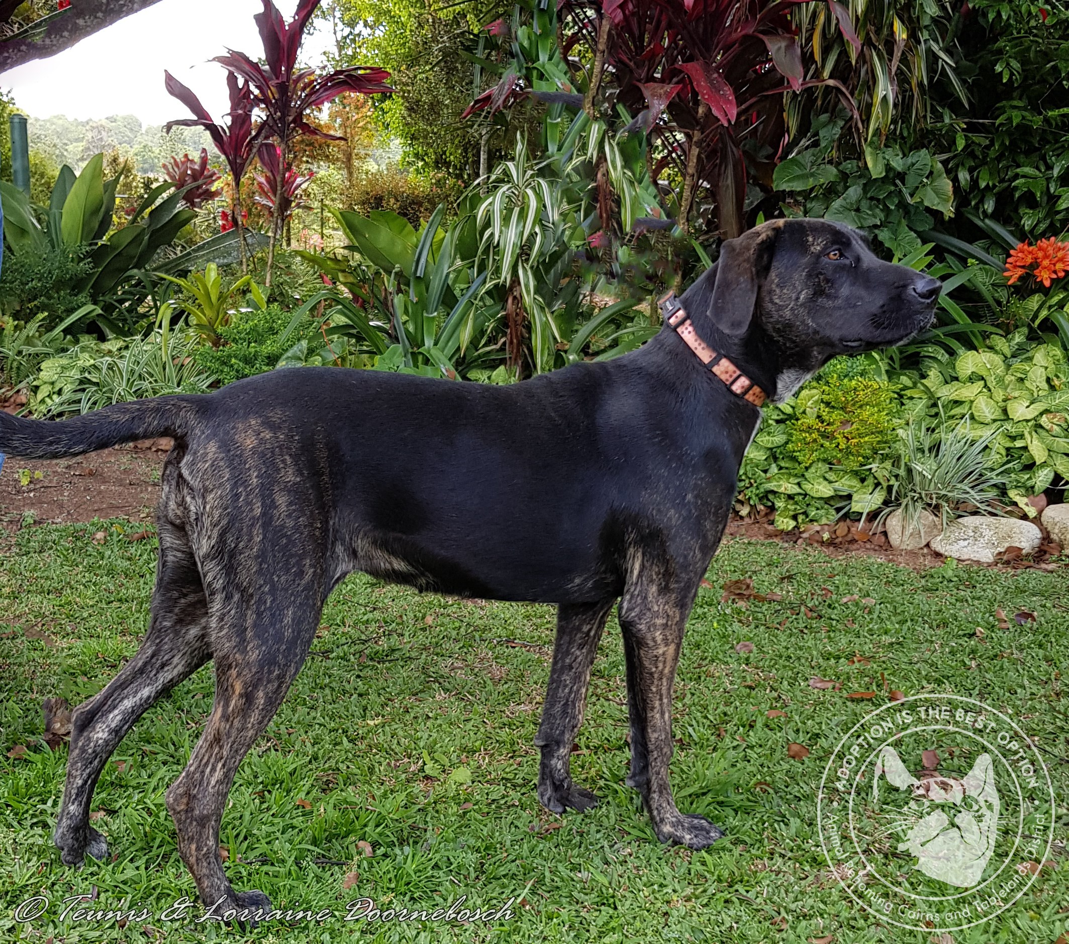 Buffy is just a young girl who came to us from the pound so we don't really know her age, but possibly around a year. Breed is also unknown, but she is going to be a very big dog, possibly Great Dane size when mature. Buffy has a beautiful temperament. She loves to play tug and lean on you, standing on your feet so you can't leave her. She hasn't been taught many manners, but she's very eager to please and is responding to training so she will learn. She's great with other dogs and used to play really gently with little Petal when they were briefly together, so she should be fine. She will submit to an older, bossier dog without reacting aggressively and is good with kids. Buffy has been crate trained, which is a bonus with sucha big dog. All her vetwork has been done which includes desexing, microchip, vaccination, worm and flea treatment and she has tested free of heartworm. In foster care in Cairns.