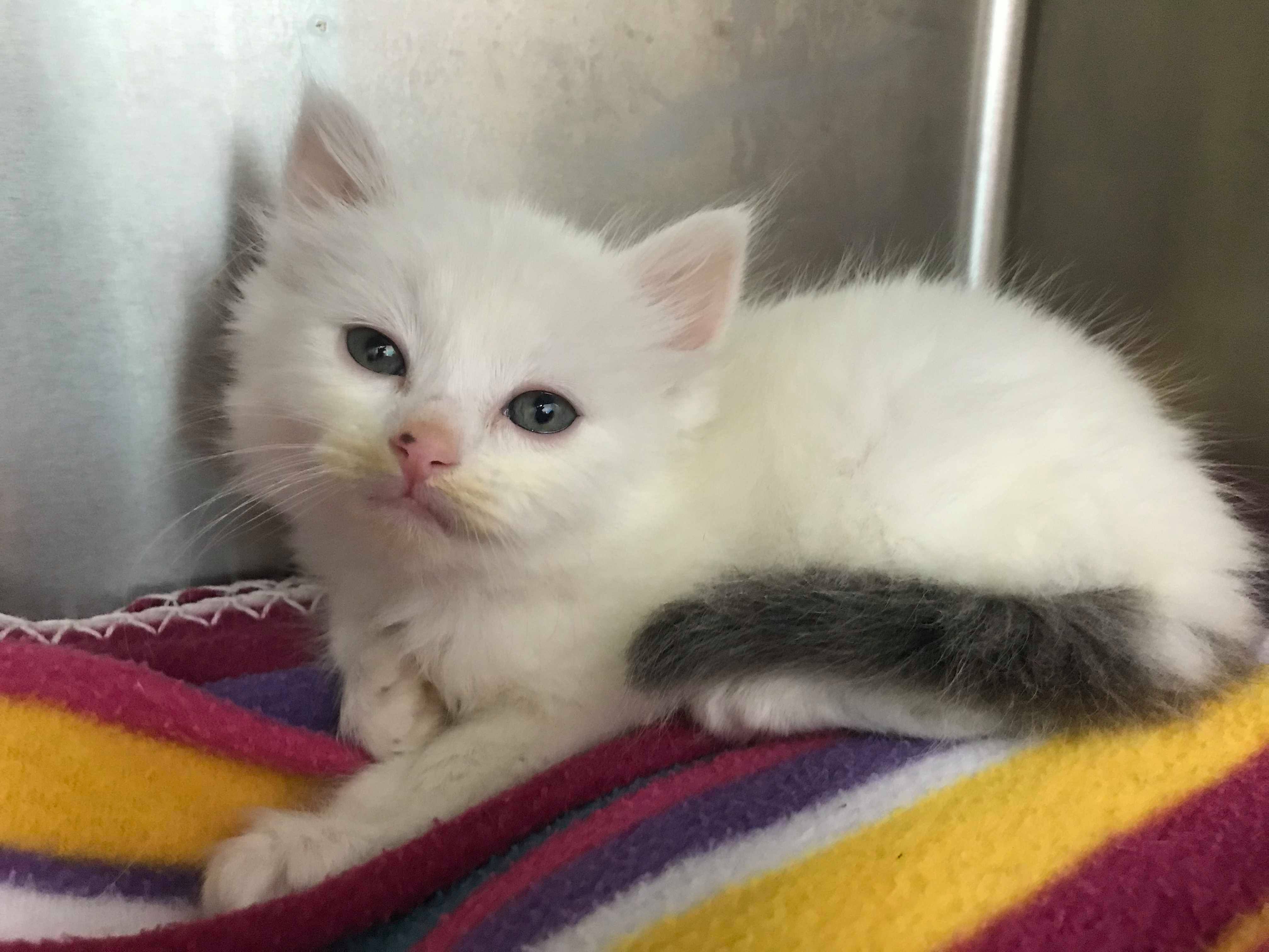 Itsuki is a domestic medium hair kitten, which means he will have a beautiful fluffy coat. He is all white with a grey fuzzy tail, and two grey patches on the back of his paws. He is a gentle, cuddly bundle of love. He is very confident and outgoing, and would really love the company of another kitten or young cat to play with. He is very keen to play, so an older established cat may not be the best companion for him! It would be lovely if you could consider adopting Itsuki with one of our other gorgeous kittens. He has loved his time in foster care with Rosie and her two adult cats (pictured with Cleo).