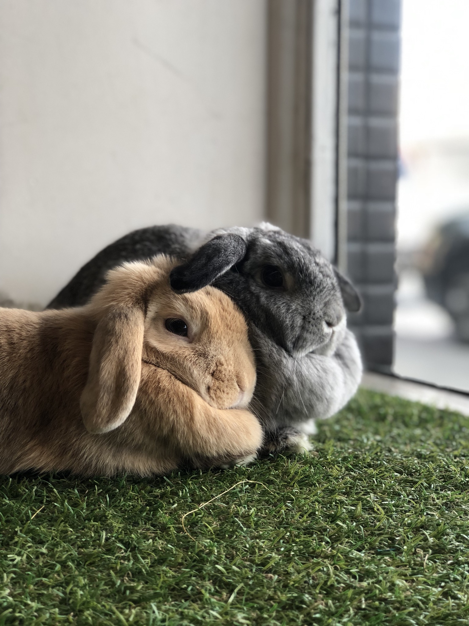 Coco (fawn) is a bit cautious and protective of Candy. She is definitely the dominant one. Candy is more open for pats and will come to you with ease. Both are more relaxed when out of a cage and as all rabbits do they love some free space. Both will be better if de sexed which is available at a discounted rate if requested.
