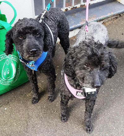 Bill and Keira are the sweetest pair of cuddly Poodles you can possibly imagine! They absolutely live for pats and cuddles and want nothing more than to get on your lap and stay there. Once there, they will bliss out completely (especially if you pat their tummies!) and when you get up they'll follow you around the house as they want to be with you all the time. They also like to bask in the sun when you're out in the garden. Bill and Keira are about to turn 9 years old and are a tightly bonded pair who do absolutely everything together and cannot be separated. They look to each other for reassurance and comfort and often have extended sessions licking each other's faces. Bill is a gentle, cautious boy who weighs about 7kg while Keira is an outgoing girl of around 8kg who is not backwards about asking for what she wants with a bark or a paw grab. Although Keira is particularly vocal, they'll both announce visitors to the house and warn off passers-by. Bill and Keira need a forever home with someone who is home a lot and willing to put in the time and effort required to make them feel safe and secure as they have a bit of separation anxiety. They love to go for walks and sit very happily to get their harnesses on and to have them taken off again. They walk well on their leads and, once a strong bond is established, it will be safe to let them off leash in your local park. From our observations they appear to be fine with children but might bark at dogs they don't know. Bill and Keira would be happiest in a home with no other pets so that they can be the focus of your attention. They're currently in a home with another dog and do exhibit some jealousy when affection is shown to him but we have no knowledge of how they would be with cats. They'd also be best in a home where someone is there most of the time as they really want that human attention and affection. If they were able to sleep with their new owners they would be in heaven as they just want to love and be loved! When you return home after being out, Bill and Keira will greet you loudly and animatedly as though they haven't seen you in years, They are both house trained but accidents may still happen if they're left alone inside for some hours so a doggy door to access outdoors is best. They're also fine with stairs once they've gone up and down them a few times. Bill and Keira don't play with toys and don't seem to understand what they are for but do play with each other and do 'zoomies' in the house sometimes. They will need regular grooming every two months in warmer months and a little less regularly in cooler months.