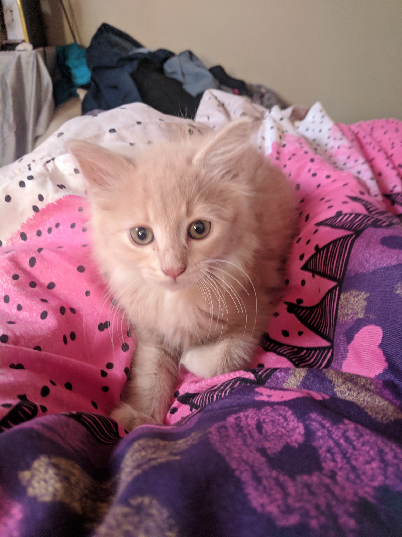 Hey guys, I’m Emmy! One of the newest, cutest additions to the OTC fam. I know what you’re thinking; man, that kitten is so ridiculously good looking. And yeah, I know. But there is more to me than being insanely pretty and a top model, okay? I am also a playful girl who loves jumping around, chasing after my brothers and sisters and sitting on your lap. I am very used to being around dogs, and don’t mind them, though I tend to stay out of their way - I’m only a small cat after all! Plus, I get to go in the bedroom and they don’t (suckerssss!). I also get along with other, unrelated cats. Anyway, it’s time for me to go and brush my hair now so I’ll catch you guys later! Love Emmy xx