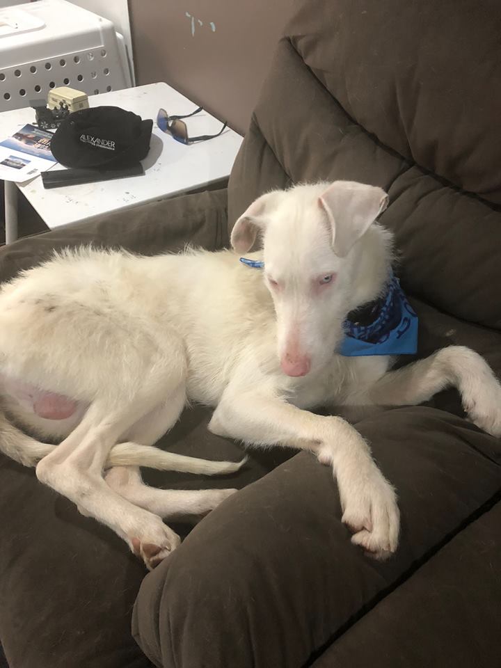 This beautiful Wolfhound X is albino and deaf!! but don’t let that put you off. He is an absolute cracker! Such a funny and hilarious dog. He loves playing… and sleeping…. And sleeping a bit more. He is currently living with is foster family and surrounded by dogs, cats and kitten, not a care in the world!