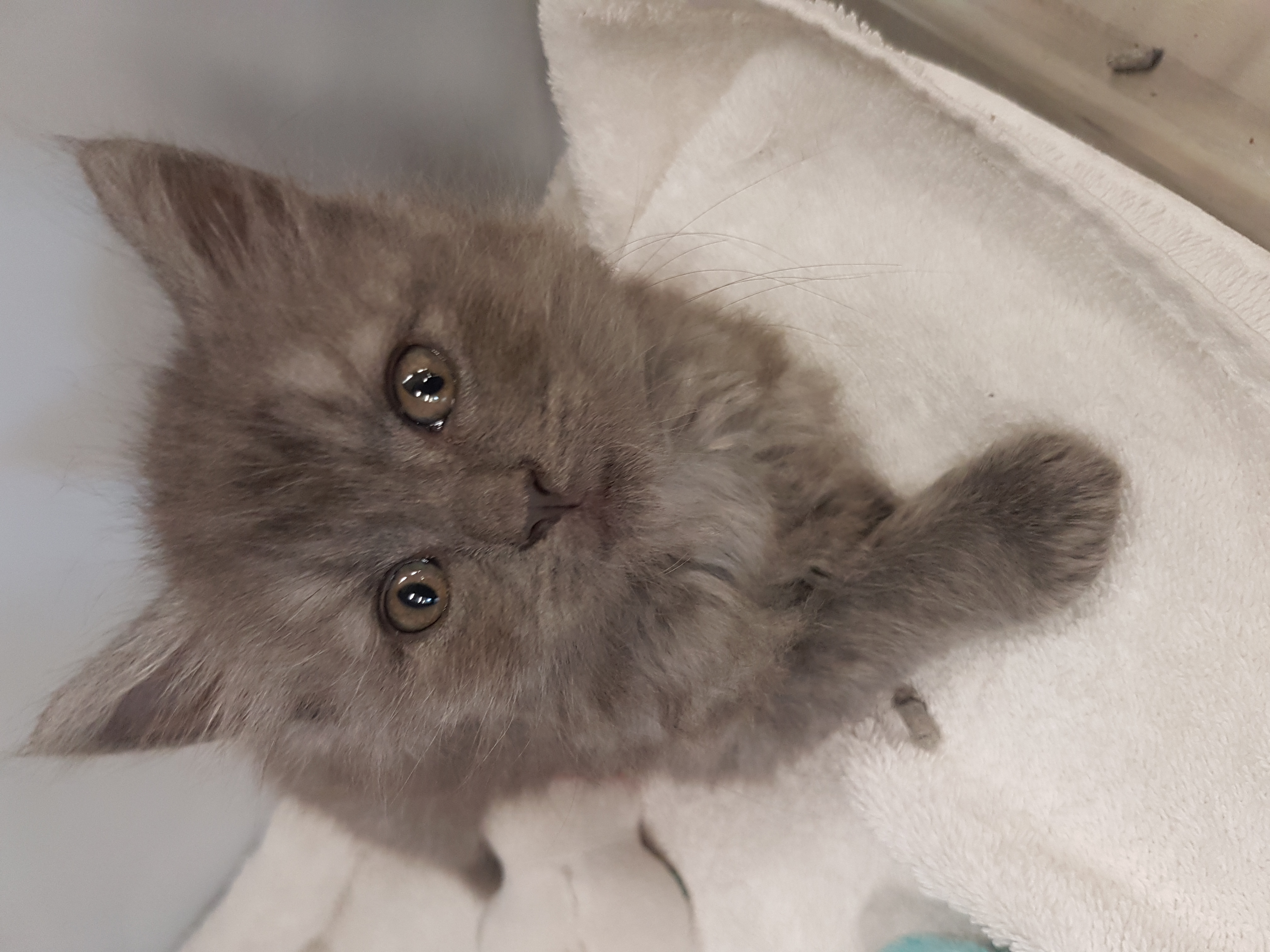 Our baby Lincoln is now ready to start looking for his forever family! Lincoln joined our rescue with his brother Noah when they were only 7 days old. He has been handraised and bottle fed which has made him so incredibly smoochy and loving towards his humans and feline friends. Lincoln is currently going through the 'kitten fuzz ball stage' and his coat is starting to grow a little longer. We think he will end up having a medium length coat, which will need brushing occasionally.