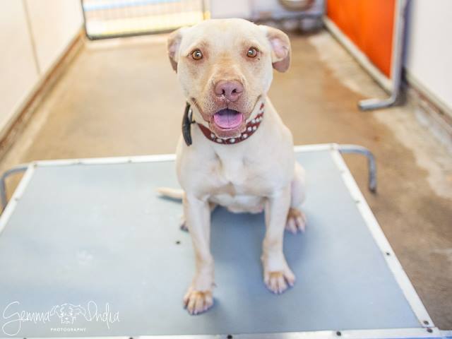 This beautiful staffy x is happy and excitable towards people and other dogs at our facility. She is about 11 months old.