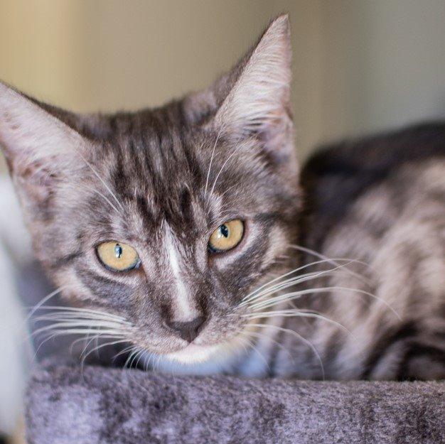History- this kitten and his siblings were surrendered in to care at the AMF. They were scared and happy to do nothing but hide. All have made great progress and now rule the house doing as they please