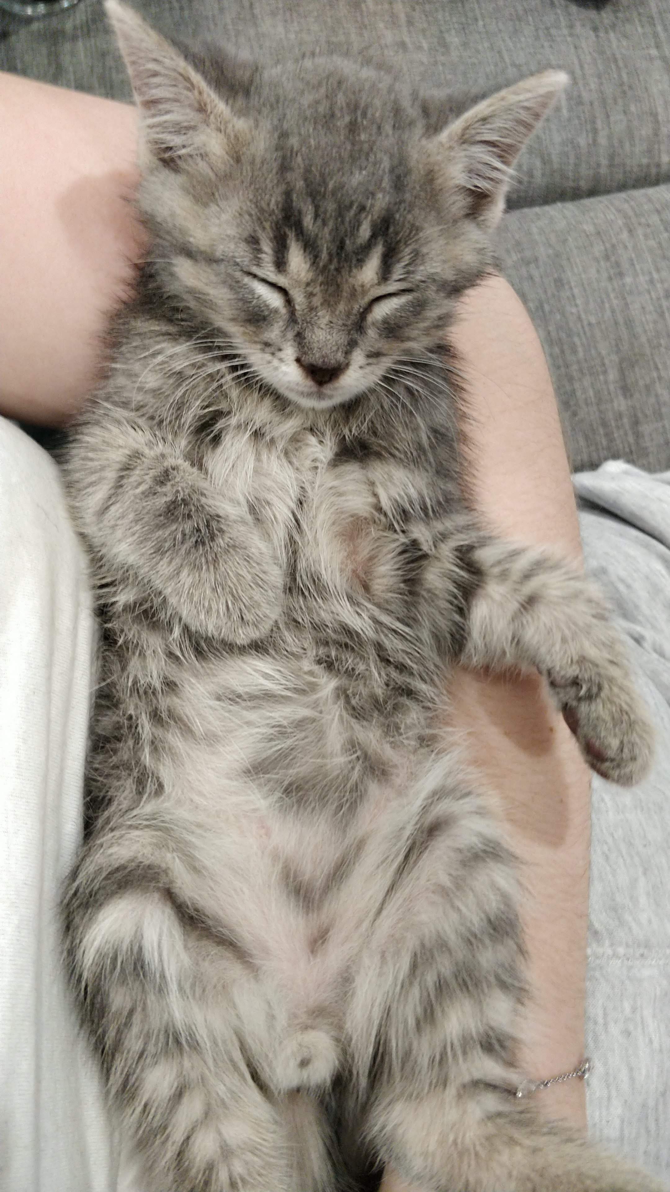Bruno is a friendly, cuddly kitten who loves to be around his humans. He is also an adorable back sleeper who has very cute sleeping poses (as pictured) and loves sleeping in your arms like a baby. He is such a heavy sleeper, you can even move him around (as you can see in the video)! He loves playing with his little brother Beau, who is also up for adoption, and his little sister Bea. If you are looking for a loving little kitten who loves to sleep and play - Bruno is your man!