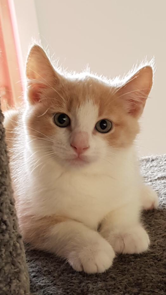 Pretty as a picture Latte is confident and playful, she will explore every inch of the house and will constantly be pouncing on invisible creatures. Her favorite toy is a Kong cat teaser that she will never tire of.