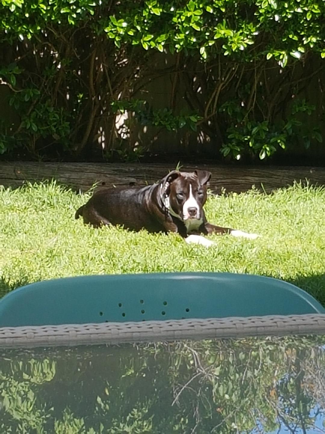 Duke needs someone or a family that will love him forever no matter what. He likes to be with his human and is a great companion. Duke is stil a puppy so don’t be fooled by his size. Duke occasionally chews items as all puppies do. He loves his toys and loves to play and has silly staffy hoons around the yard. He can use a doggy door and sleeps well threw the night. Duke is house trained. He is left inside alone and has not done anything wrong.