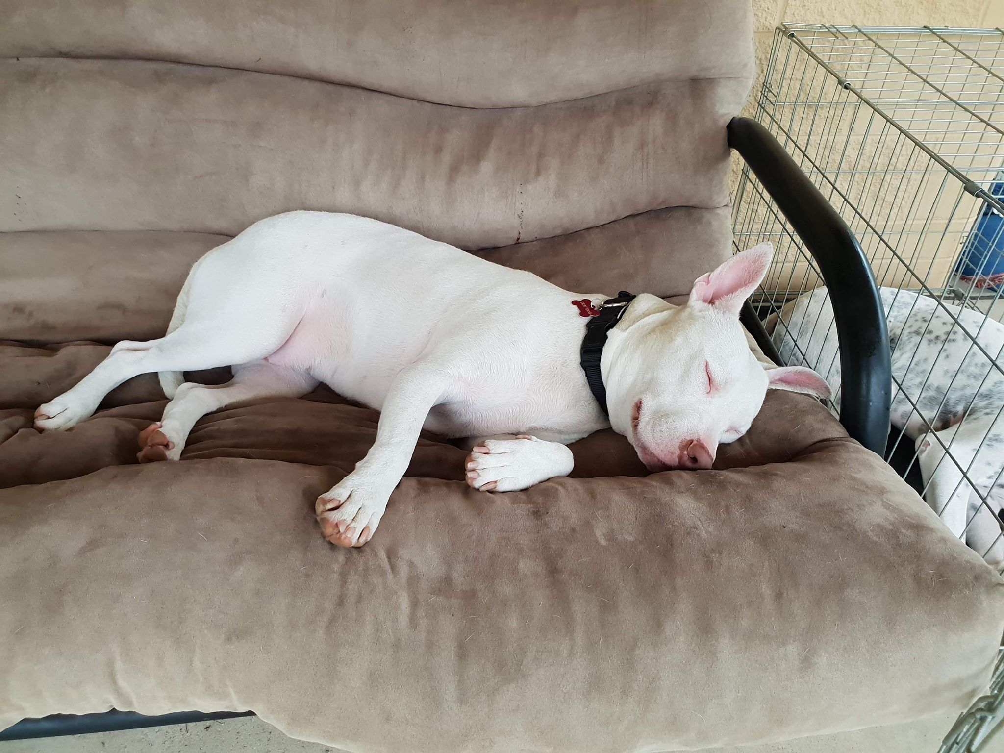 Frankie 2 years old and is deaf. She is a very sweet girl but can be a bit bossy at times when around other dogs. She'll be super active and playful but when she's had her fun she'll let them know she's had enough.