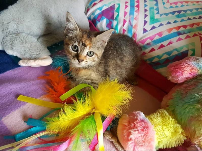 Gorgeous, playful, friendly 8 week old female rescue kitten available for adoption. Has a lovely personality and would suit almost any household. She is toilet trained and gets along with other pets.