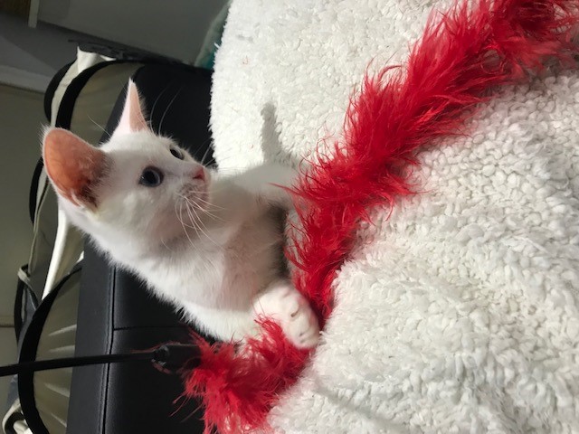 Hi! I’m Snowy and I am a very affectionate white boy with striking blue eyes. I love cuddles with both humans and cats alike, and love to play with best friend Cream. When I want attention I climb all over my foster mum and give her a good groom. It’s really hard to resist my cute little face, especially when I’m purring loudly for the world to know how happy I am!
