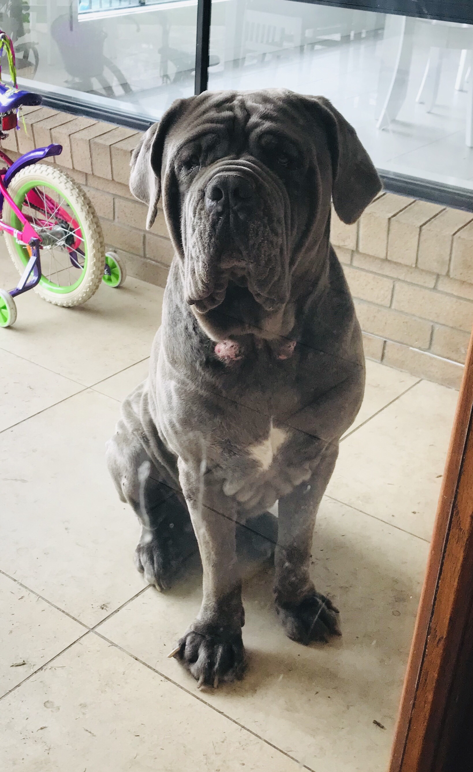 Zeus is a 4 year old male neo mastiff who has been part of the same family and kids, since he was a pup. He has been well cared for but now needs his forever home due to the owners no longer being able to have him. He is very friendly and affectionate and enjoys playing catch, taking baths but most of all relaxing in the sun. He is blue/grey in colour. Due to the size of the dog it’s recommended that they aren’t homed with other dogs so a single pet home would suit him best, with older kids ( even though he loves kids, he is very large so bigger kids are best suited)