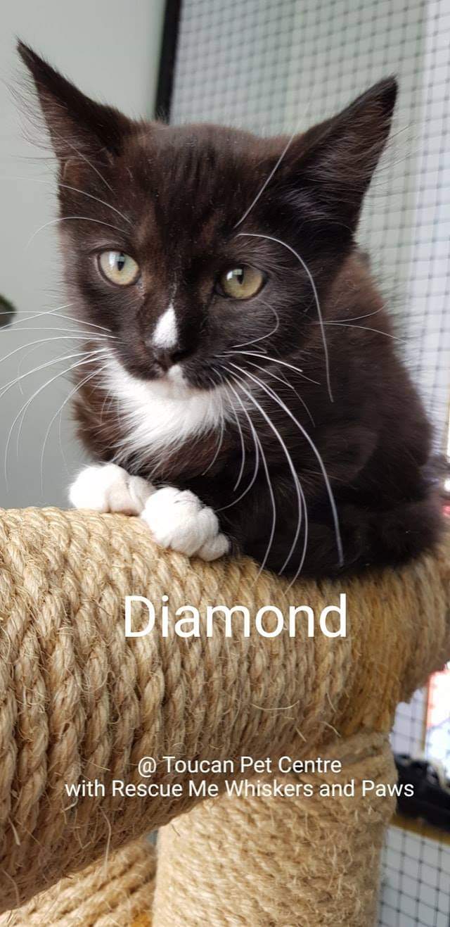 Hi I'm Diamond. I came into care when I was found in a garden at an aged care facility and they contacted Rescue Me Whiskers & Paws. Initially I am a quiet and reserved little guy who likes to sit back and watch whats going on. Once I am comfortable, I am an extremely friendly, playful and sweet little guy, who is always waiting to run and play or have snuggles and kisses and boy do I purr! I love to wrap around your feet for attention. I happily live in foster care with other cats/kittens, dogs and my big and little foster carers. I'm an affectionate, super playful and cuddly kitten, who will make you smile non stop. I love to lay on your lap and have ear, chin and belly rubs (belly rubs are the best!). Or if your busy I'm happy to follow you around the house supervising what your doing. I am an INDOORS ONLY kitten, but I love it best there because I feel safe and love being near my family. I will need a special home with someone who can give me lots of love, understanding, time and patience to adjust to a new environment and when settled I will give lots of love and kitty cuddles.