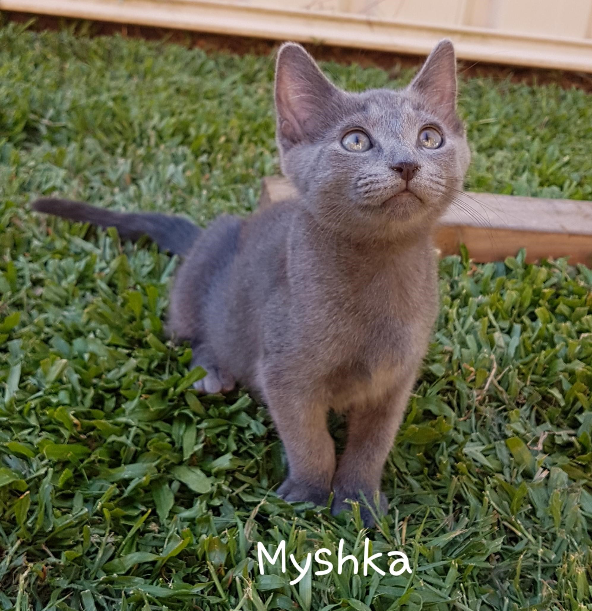 Myshka has a mix of Russian Blue in her. A very affectionate and friendly kitten. Very sweet and cuddly. Loves to play and enjoys company of younger children. Also lets the younger children play with her, pick her up and play chase around the house. Tolerant of other cats and dogs.