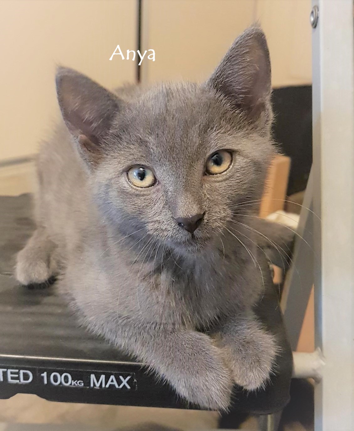 Anya has a mix of Russian Blue in her. A very affectionate and friendly kitten. Very sweet and cuddly. Loves to play and enjoys company of younger children. Also lets the younger children play with her, pick her up and play chase around the house. Tolerant of other cats and dogs.