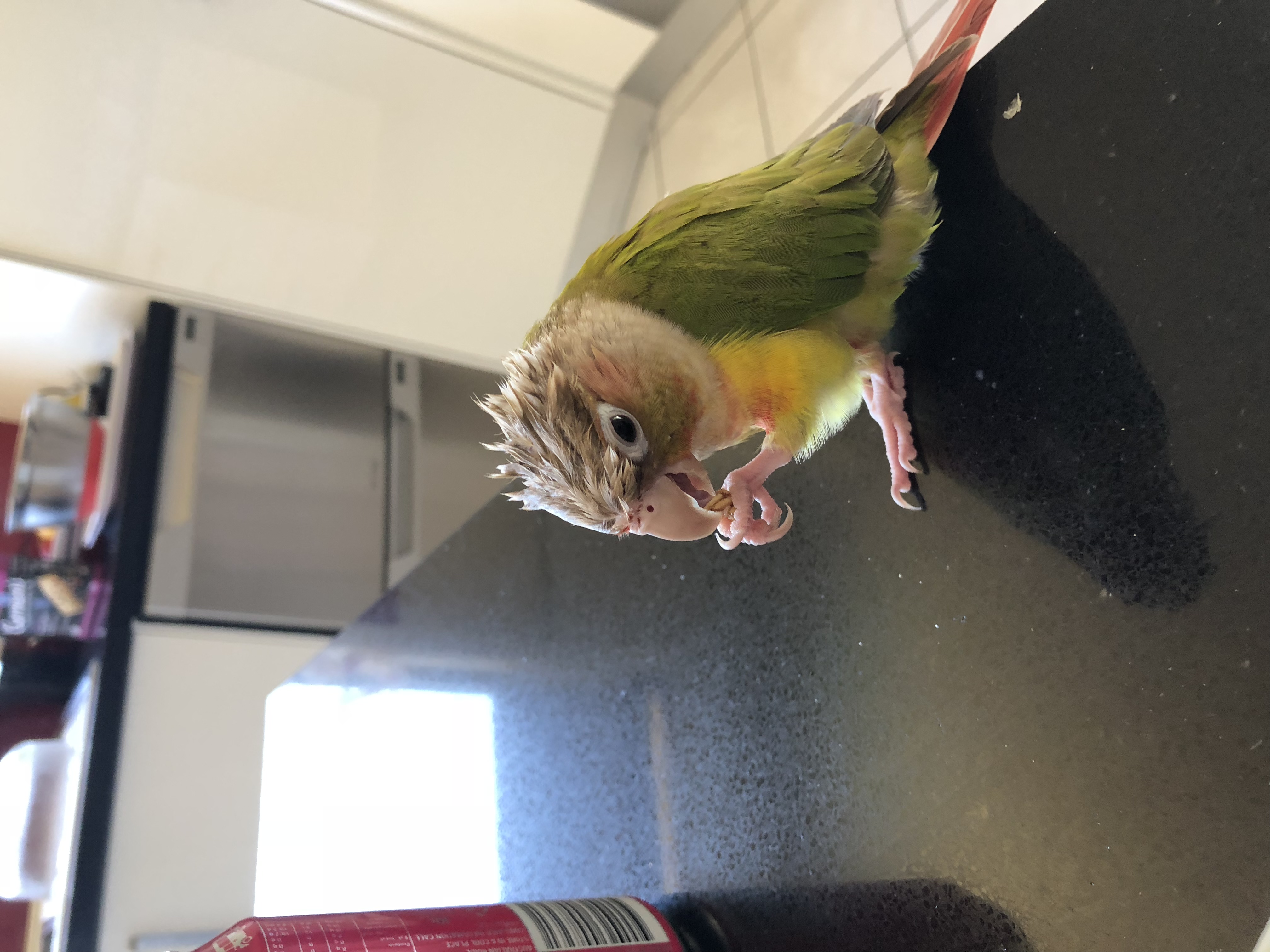 Erdo is a young pineapple green cheek conure. We refer to him as a male however we are in the process of testing for his correct gender.