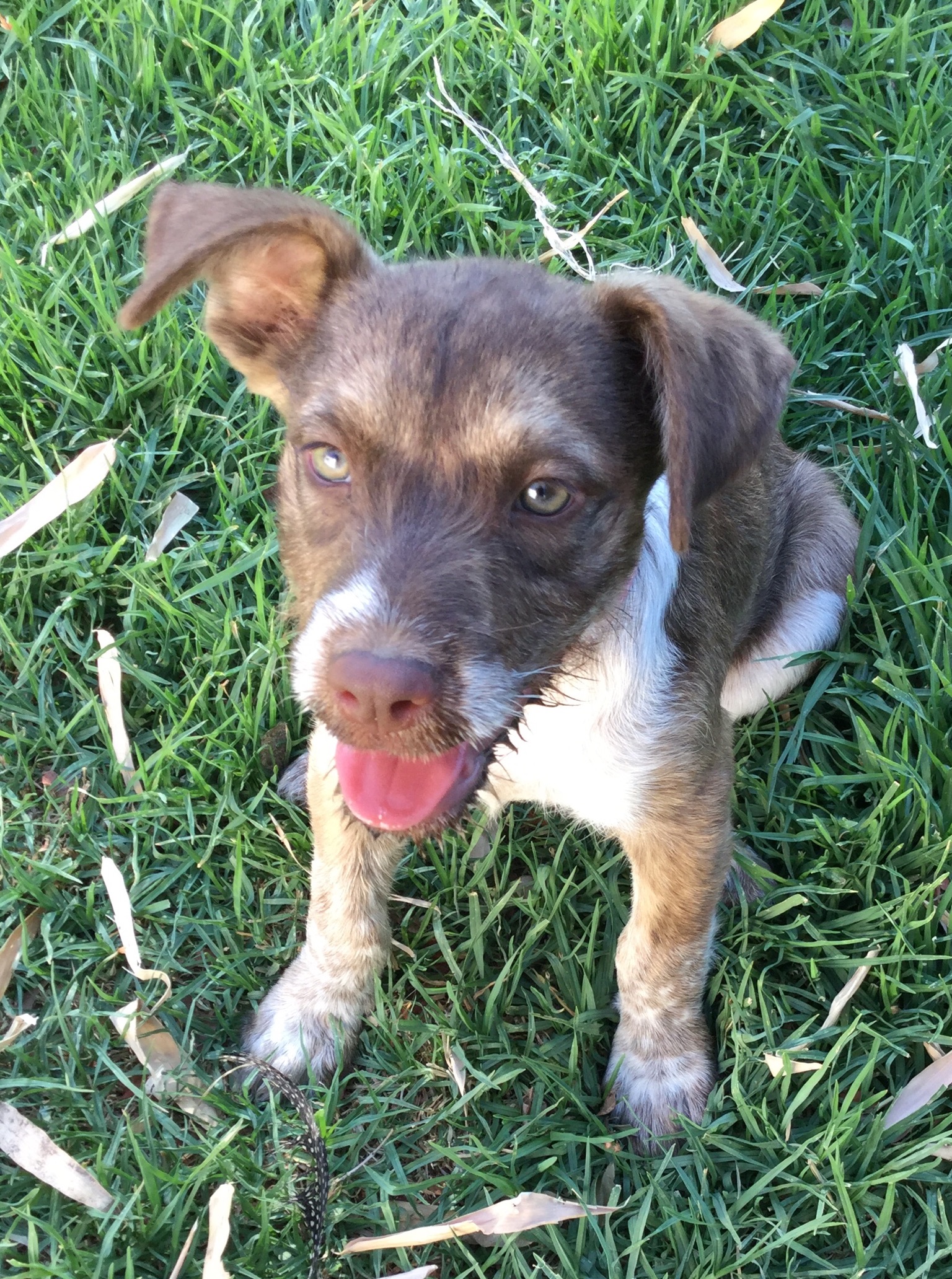 Beautiful little Simmi with that cute whiskery face and unusual coat and eye colours. It’s a bit hard to know what breeds are in her, but probably Koolie, possibly a dash of Wolfhound.