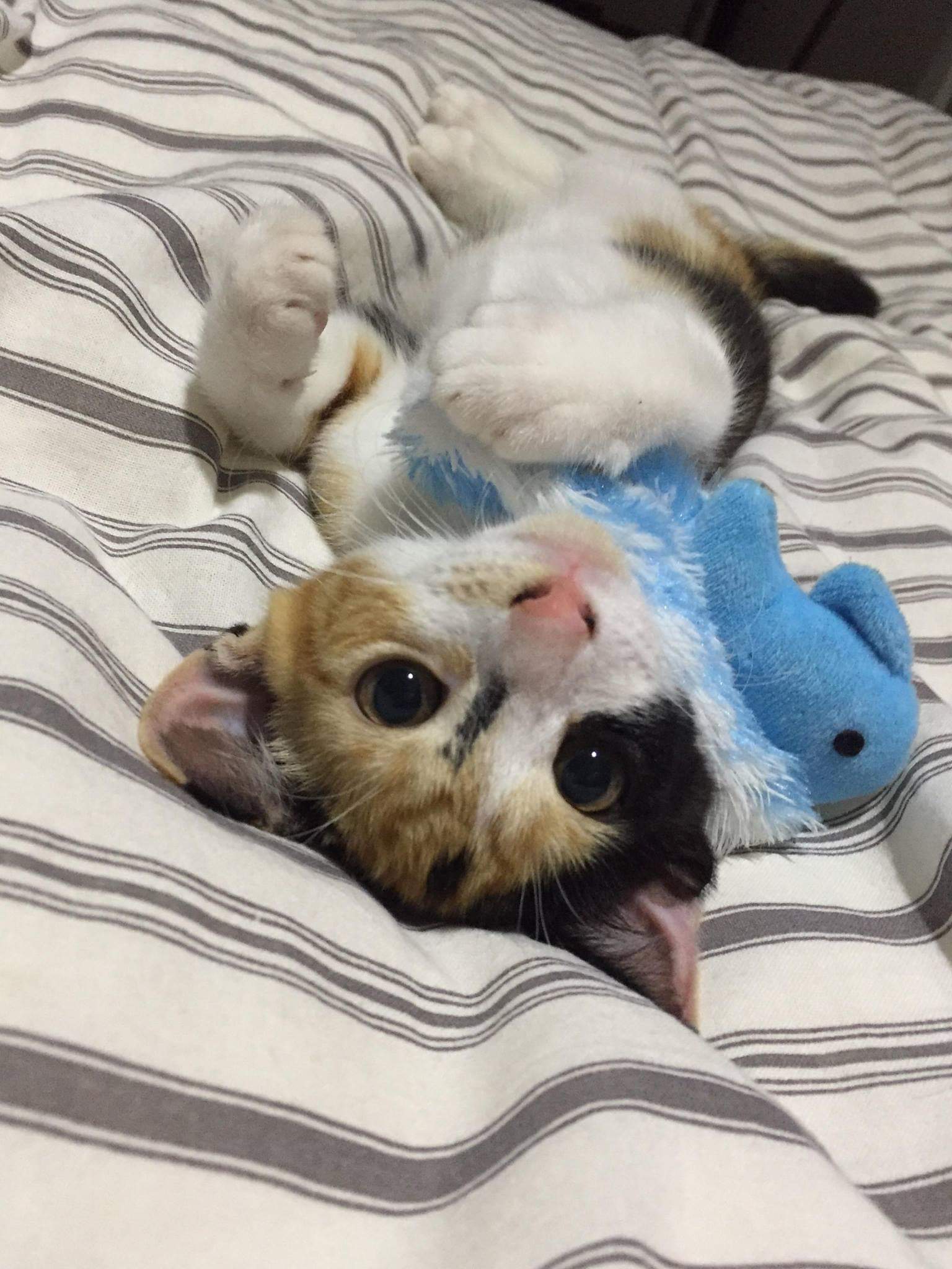 Mia (calico girl) is a little shy but certainly loves her belly rubs and snuggles.