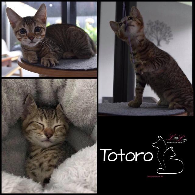 Totoro is a sweet confident young man who loves everyone he meets. He has beautiful markings and we are sure he thinks he is a little tiger! Totoro loves to spend his days chasing his sister Tibs or any toys he can find. He will run around on the hunt until he decides it is time to rest and then collapses on the nearest lap or chest. He likes to snuggle close and sometimes plays a little game with his sister of ""who can get the closest to our human's chin"". If there isn't a free human he will happily curl up in his bed or on the floor in the sun. Totoro is currently with older children (14 and 16) and adores his teenage siblings. He isn't tested with smaller children, but he is pretty relaxed guy, so I think he would be fine in any family.