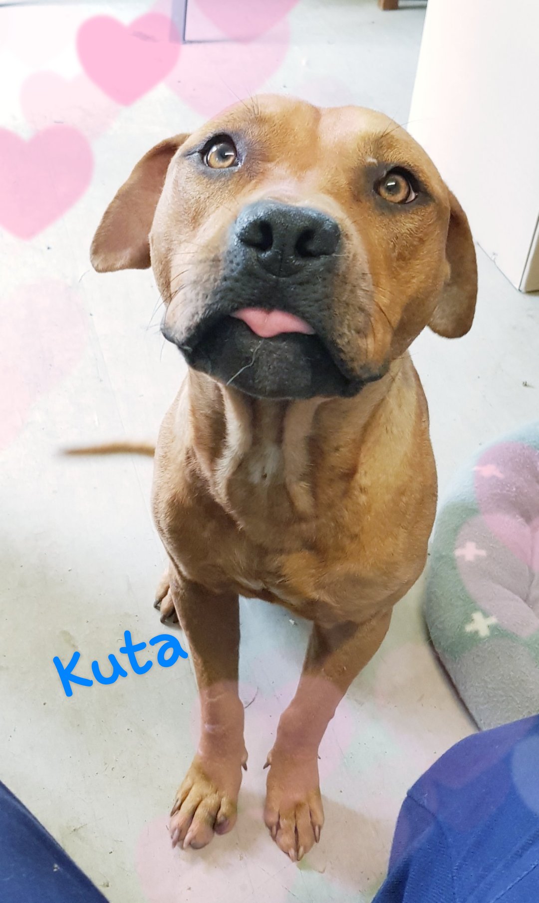 Kuta (pronounced Koota) is just the most adorable boy I've met in a long time. He's had a pretty rough time somewhere in his past and has a few battle scars. These just make him more handsome! He hasn't let what has happened to him change what a gorgeous boy her is! He is such a gentle and quiet soul who gets on great with other dogs. He hasn't barked at all since he's been here. He's not destructive and just curls up on his bed to pass the time. Kuta will love a special home where he is covered in hugs and kisses!