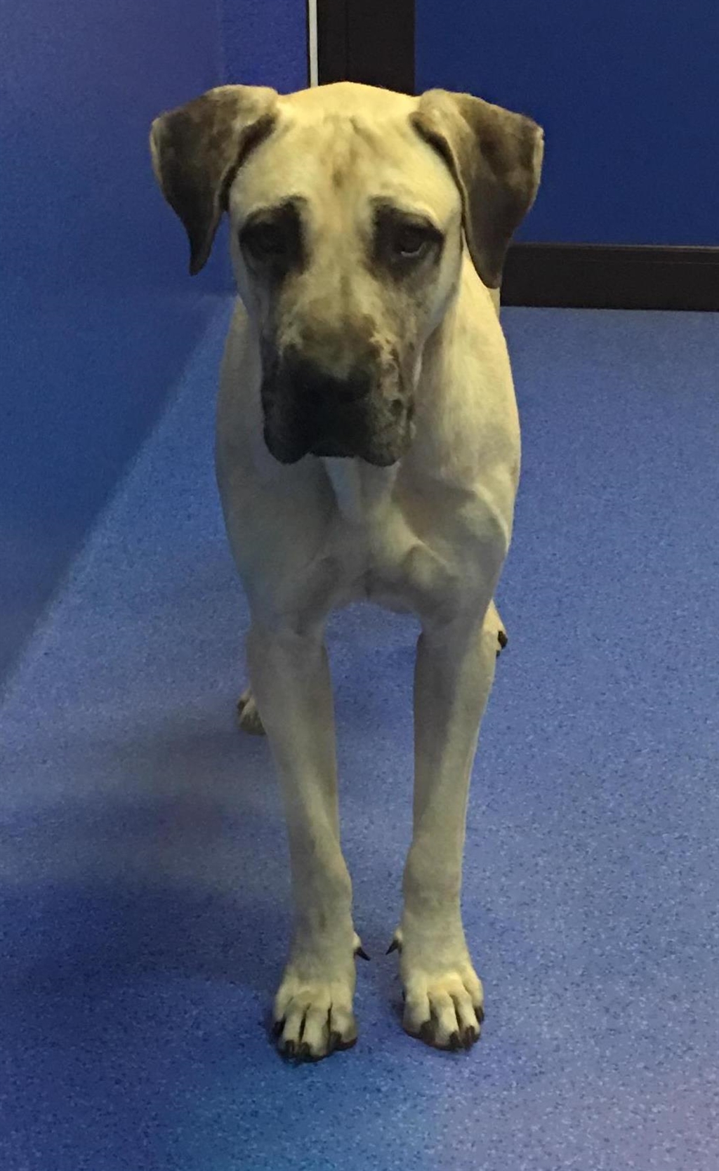 Leonard is a big gentle giant who loves to lean in for pats and affection. Leonard is not very interested in toys and he much prefers to spend his time interacting with you. He loves his food! and he knows his sit well and is gentle with his interactions. Leonard can be unsure with close handling so his new owner will need to go slow and make interactions positive.