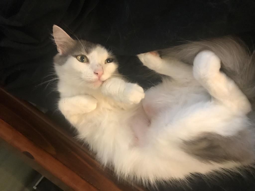 Hi my name is Vienna. I am a beautiful medium hair black smoke and white female cat. Once I have been picked up I flop in your arms on my back and let you pat me to your hearts content. I am a very happy cat and I am always purring, but my purr is so quiet the only way you know is from the vibration whilst I am in your arms.