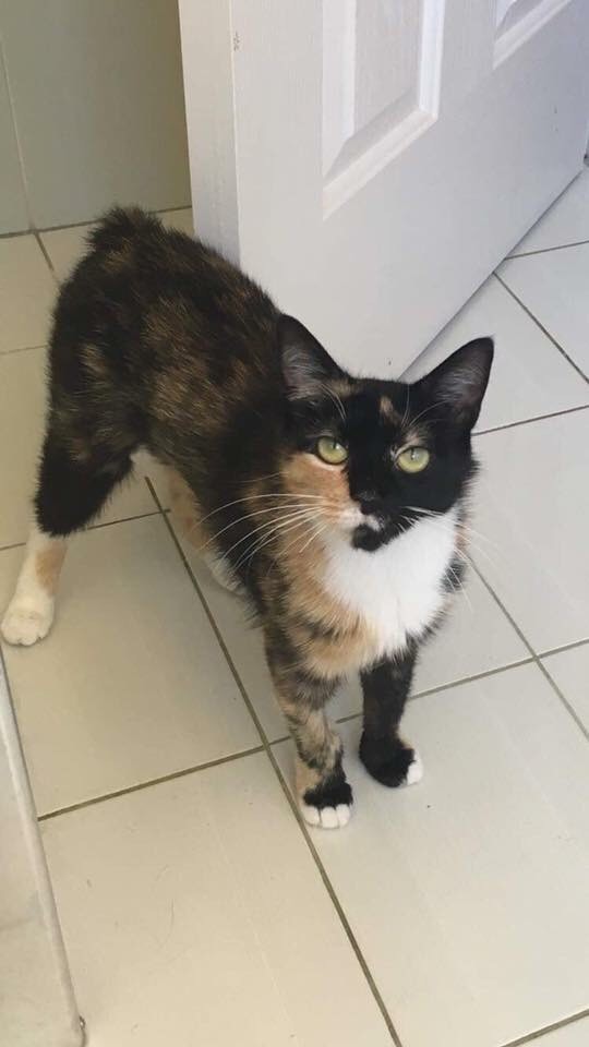 This gorgeous tortie Manx Sapphire was found dumped in the hills with her babies and caught and bought to the rescue.