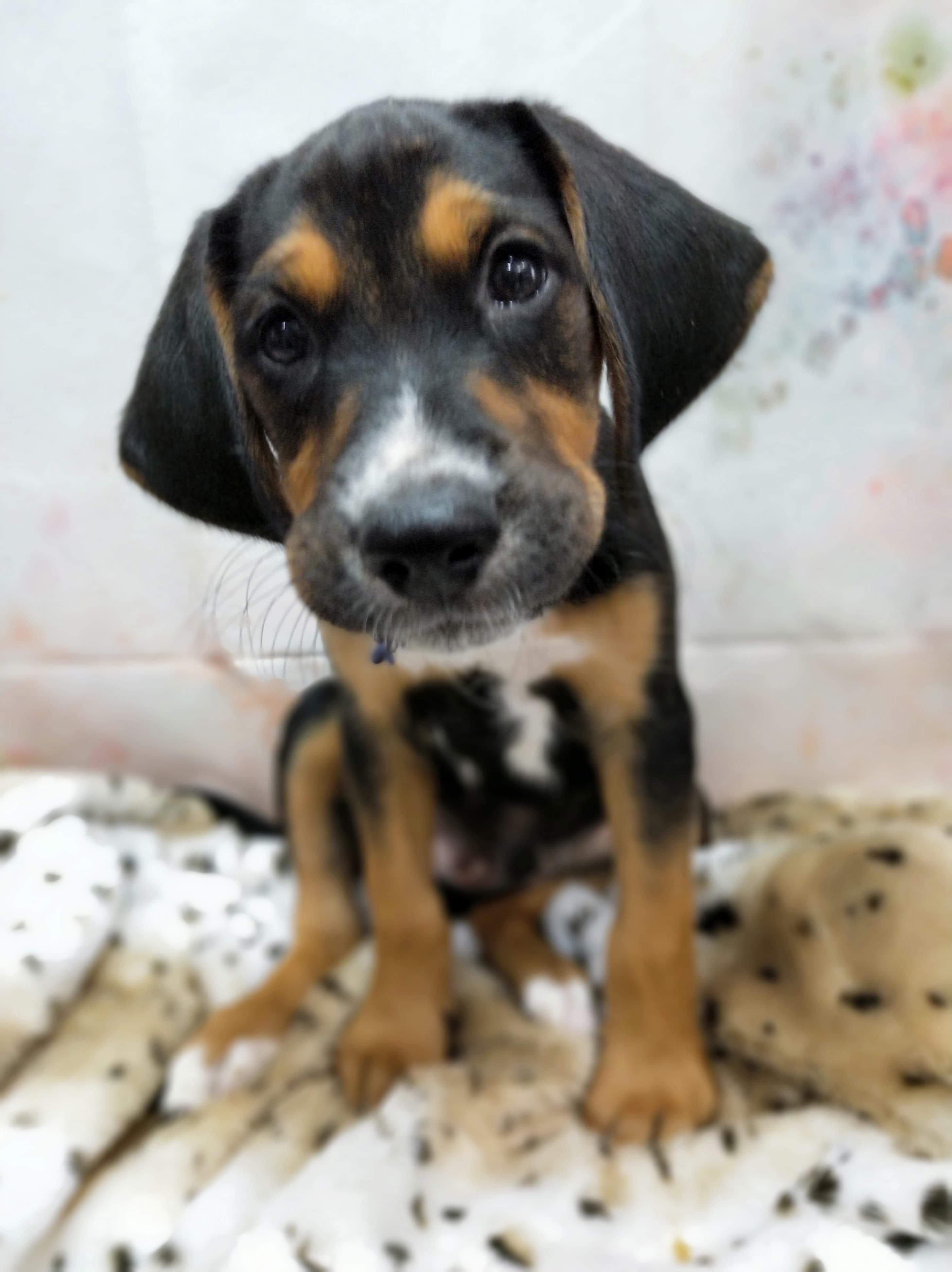 Meet Owen! A 6 week old Foxhound X puppy. One of two boys in this litter and a boy who knows his place amongst his sisters. His soft ears and excess skin make him pawfect for cuddles. He'll sneak in a lick too.