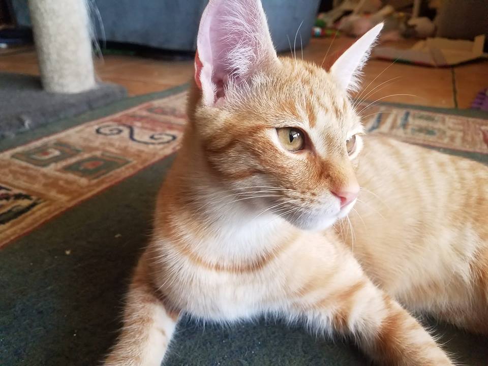 Axel is a sweetie. He loves to race around, climb up and down, and roughhouse with whomever will play. He is enthusiastic about food, and always needs to check out what the people in the house are eating. If you have food, he is your best friend. He is cheeky, and chatty, with a sweet meow, and a very loud purr. He loves head scratches, will rub around your ankles, and rub himself on your hand for scritching. He plays well with the toddler, and copes well with being “patted” and “brushed” with little baby hands.