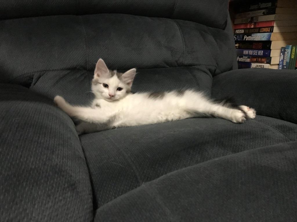 Hello my name is Dice, I am a medium hair white and black smoke boy kitten. I am a little cutie but as soon as I am in the car I will sing you the song of my people and let you know that this containment is not acceptable.