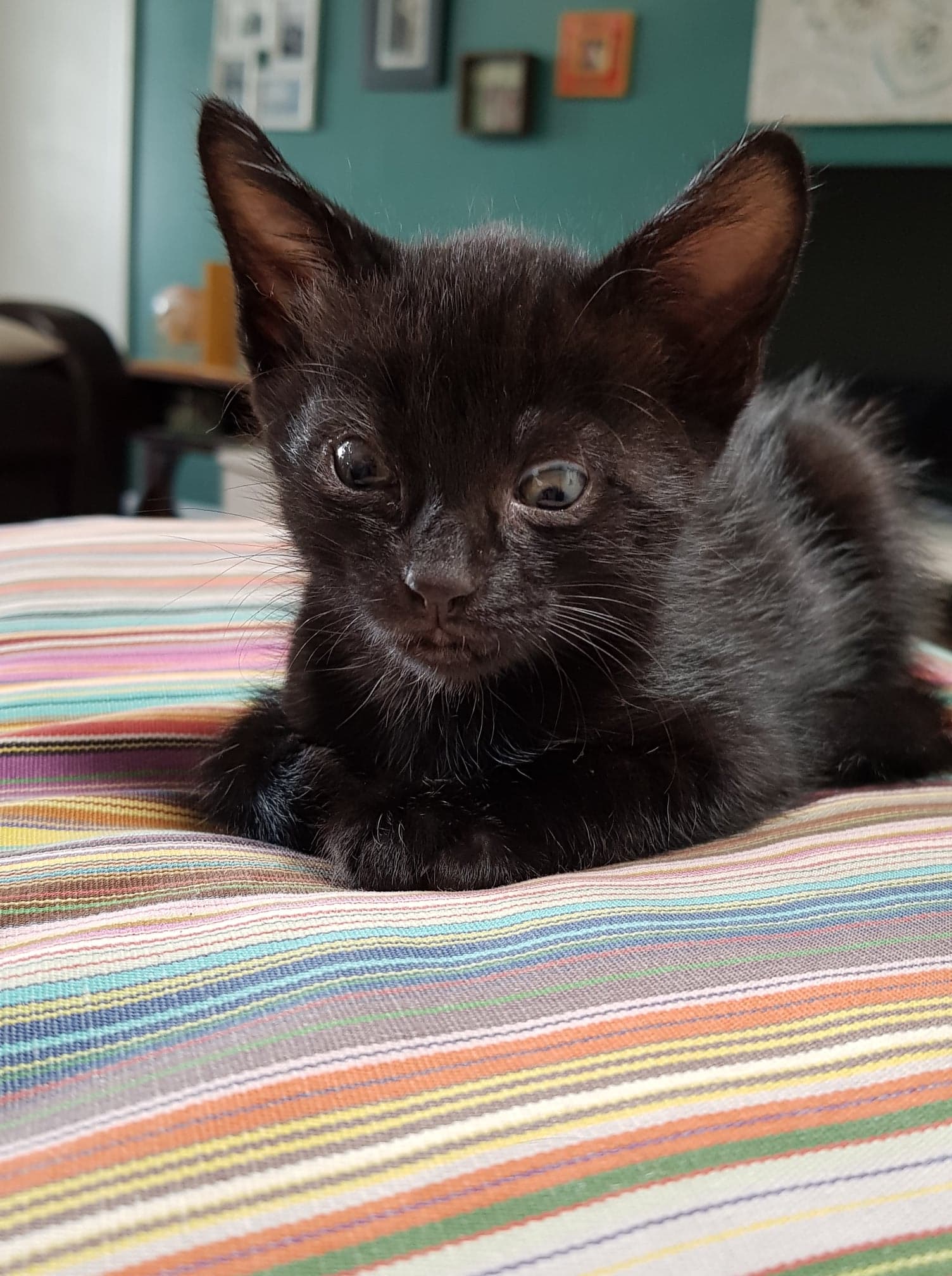 Hi, my name is Glass and I’m an 8 week old black kitten. I was born with something called bilateral eyelid aplasia which means my upper eyelids didn’t fully develop when I was in mummy’s tummy. Because of this my left eye points in another direction but I can still see you perfectly fine! I just need some help at the moment to put ointment in my eyes twice a day (morning and night).