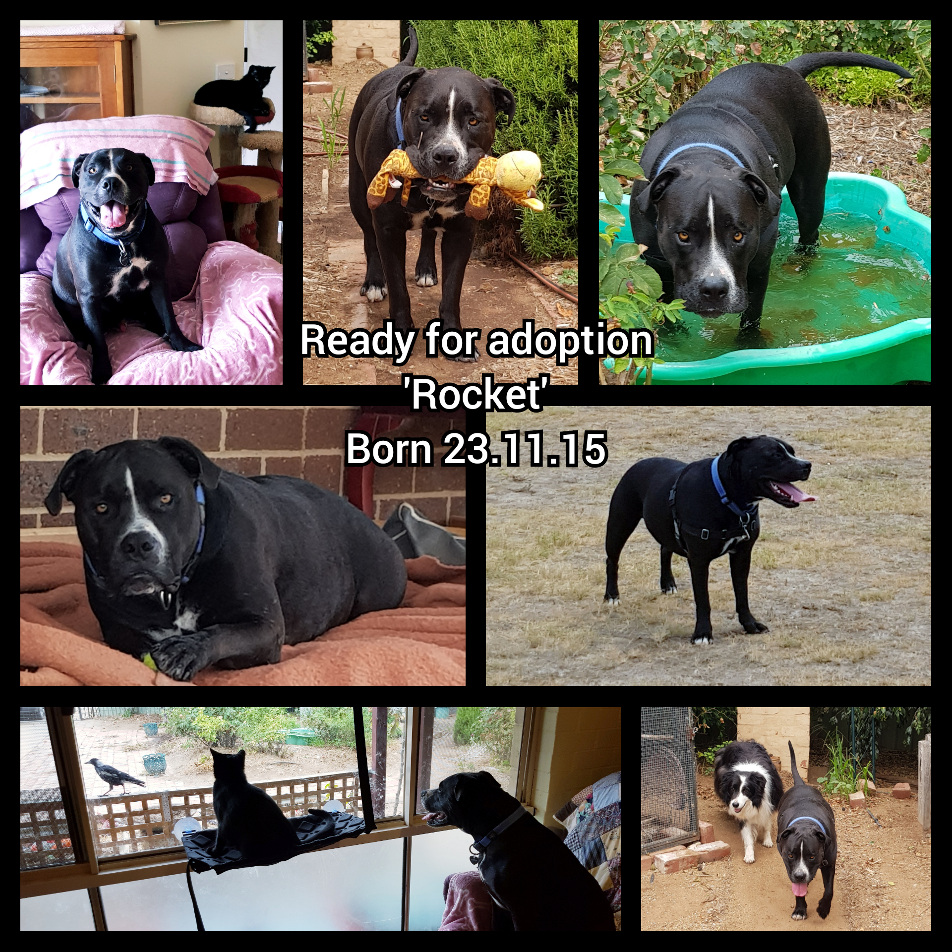 Rocky is a delightful 3yo Staffy x who is cat and other pet friendly.