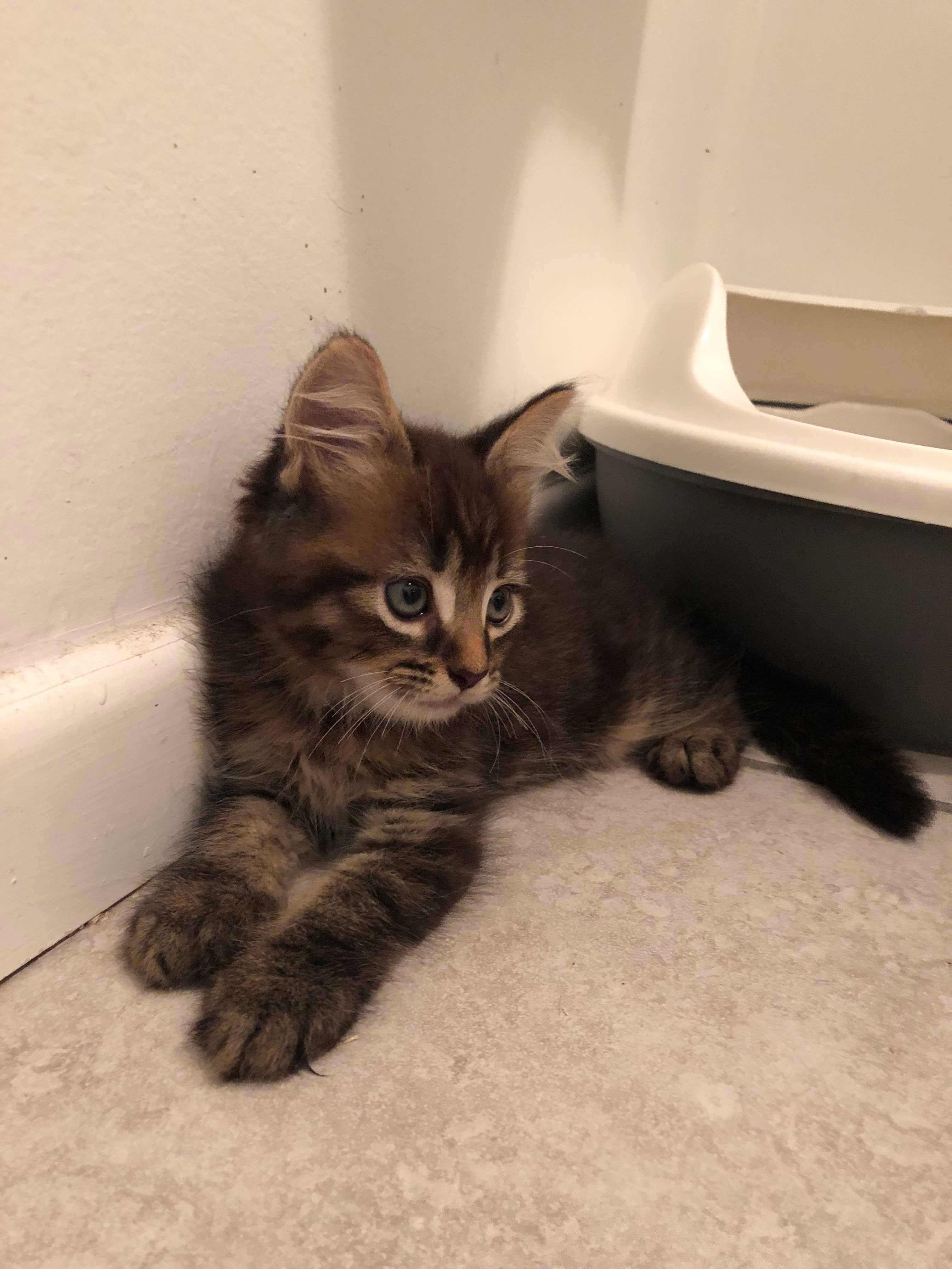 Ravioli is the most confident kitten of his litter! He is also twice the size and twice as fluffy as his brothers, he will be a little bodybuilder. Right now all he's interested in is tackling, running, jumping and flying through the air but if you can pin him down for a cuddle he won't object (probably best to tire him out first). If you want a kitten that will grow into a big beautiful cat I think he is your man!