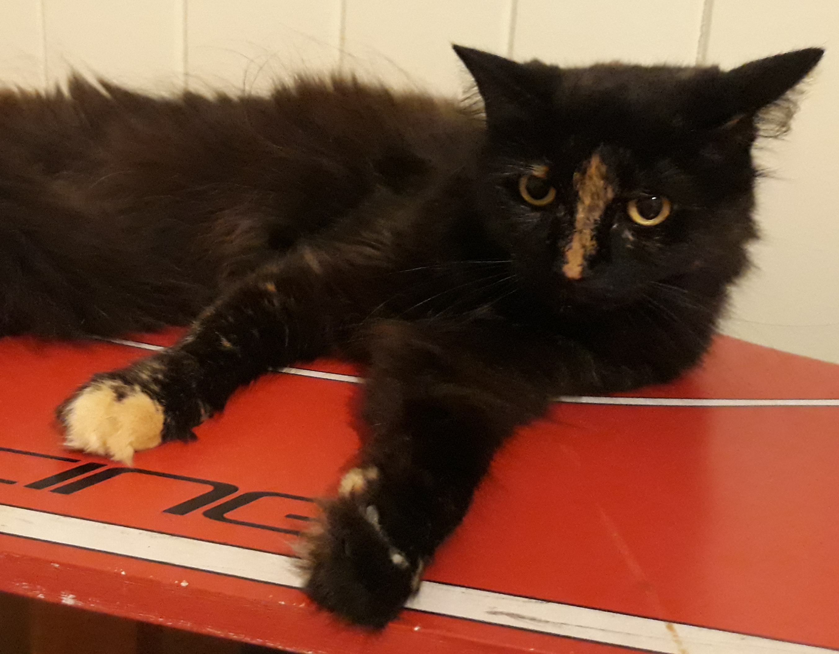 Colour – Black with a bronze stripe down her nose