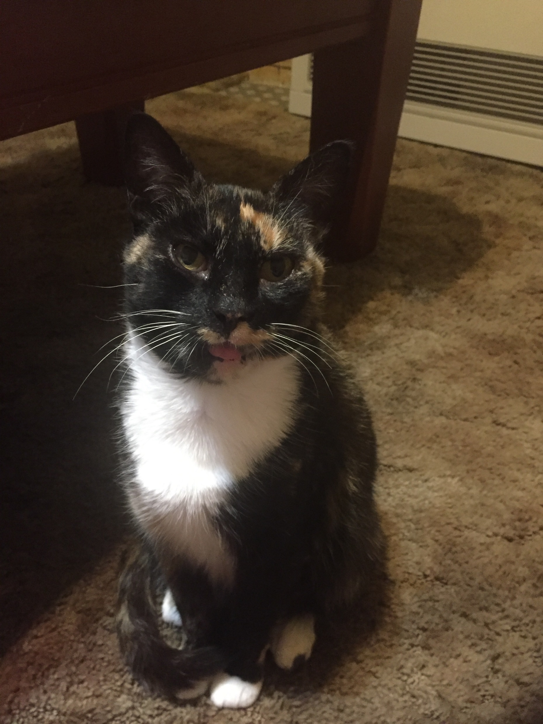 Lola is one sweet affectionate cat. She has been through tough times which have taken a toll on her teeth but the necessary work has been done and her toothless grin is adorable. Her loving and trusting nature is unparalleled; just looking at you she will purr. She has this sweet little voice that sounds like singing and likes to stick her tongue out.