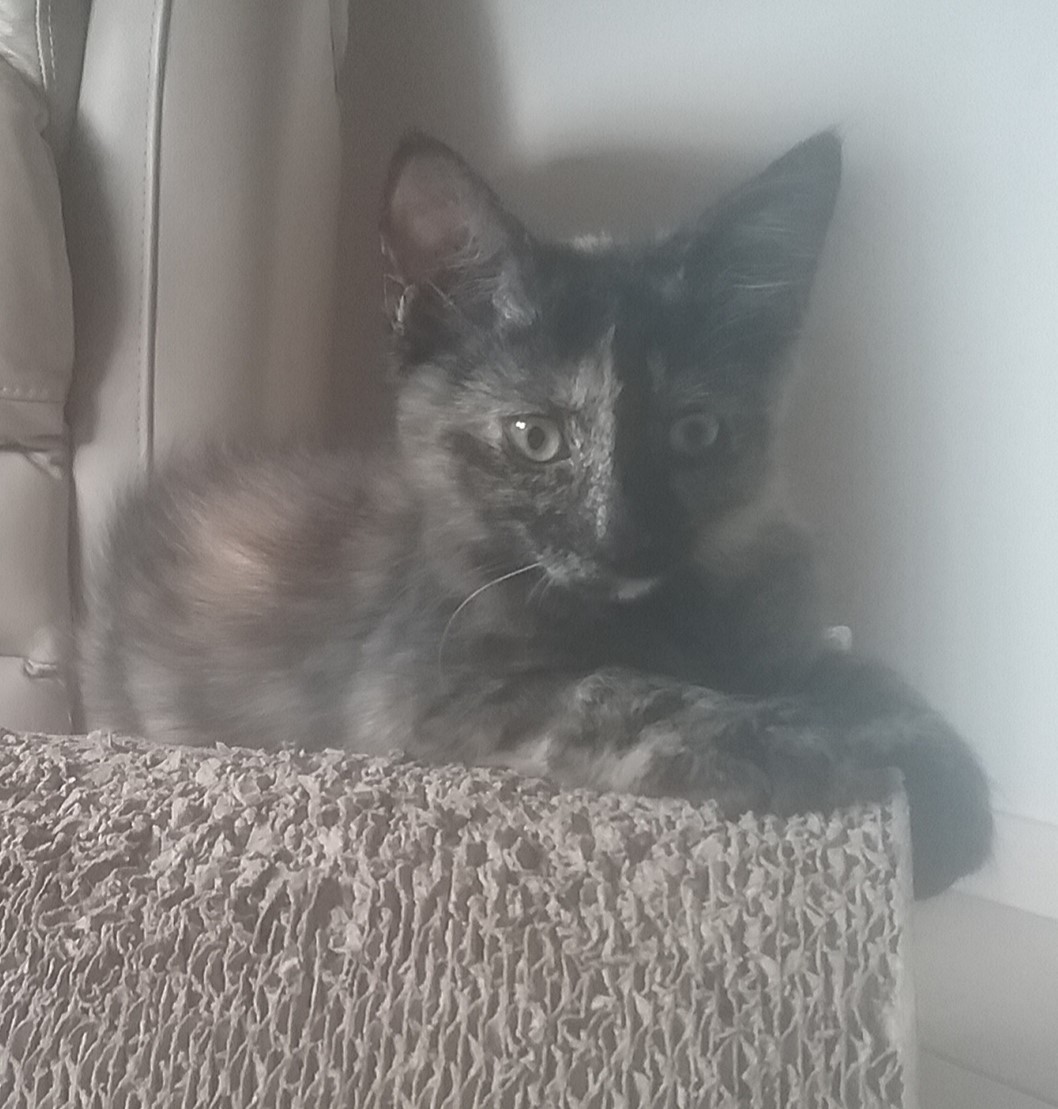 Poppy is a very pretty and unusual light grey tortie (tortoise shell). Her fur is medium length so will not require grooming but is beautifully soft. She is a little more reserved than her brothers but able to hold her own in the rough and tumble of kitten play.