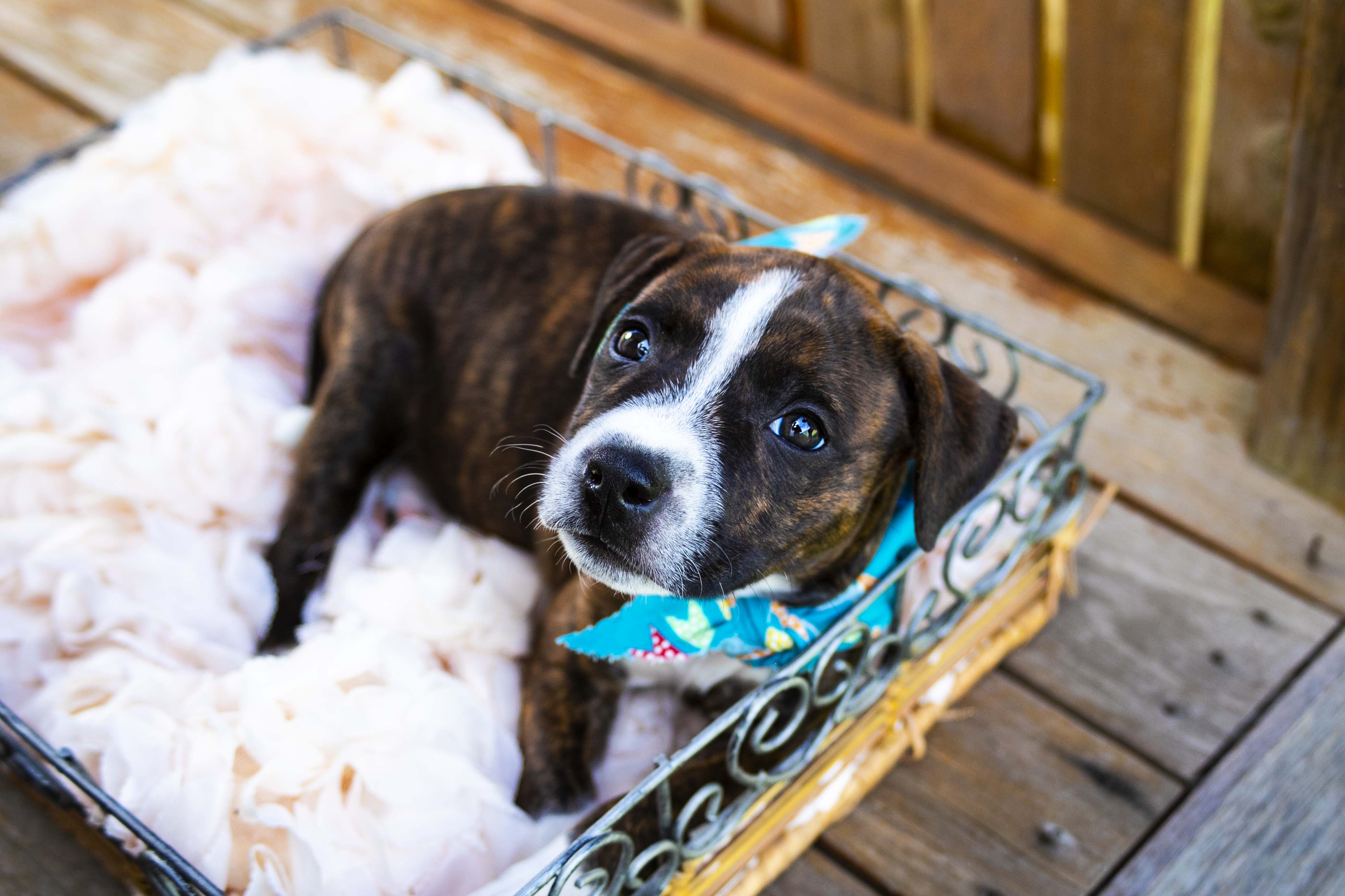 April is a 7 week old, female, Staffy x puppy. This playful girl is full of energy and loves to tumble.