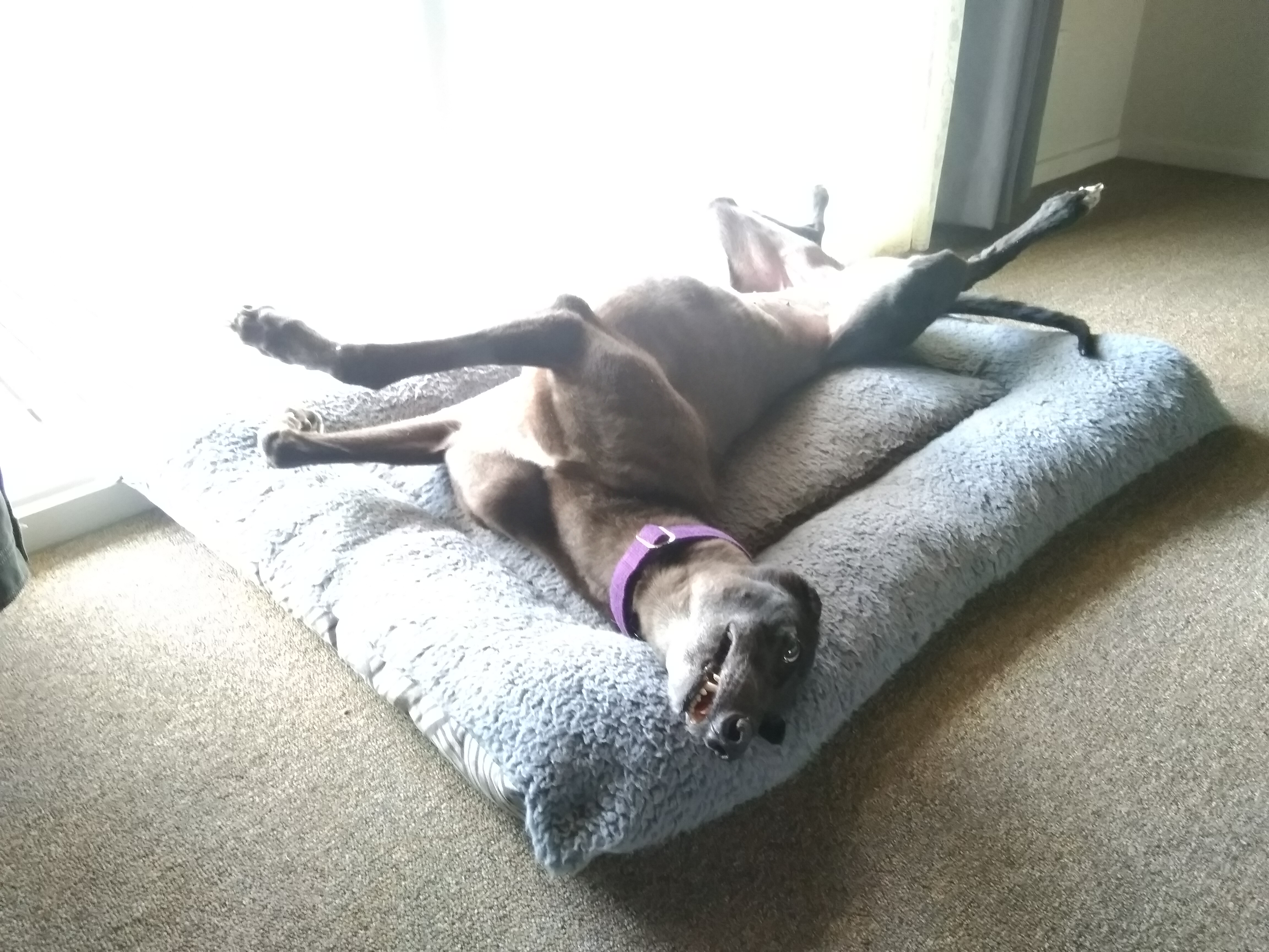 Bella is a very sweet little girl. She wasn't taught to sit, she just started doing it on her own accord, that is how clever she is and as we know only a small percentage of greyhounds sit like this.
