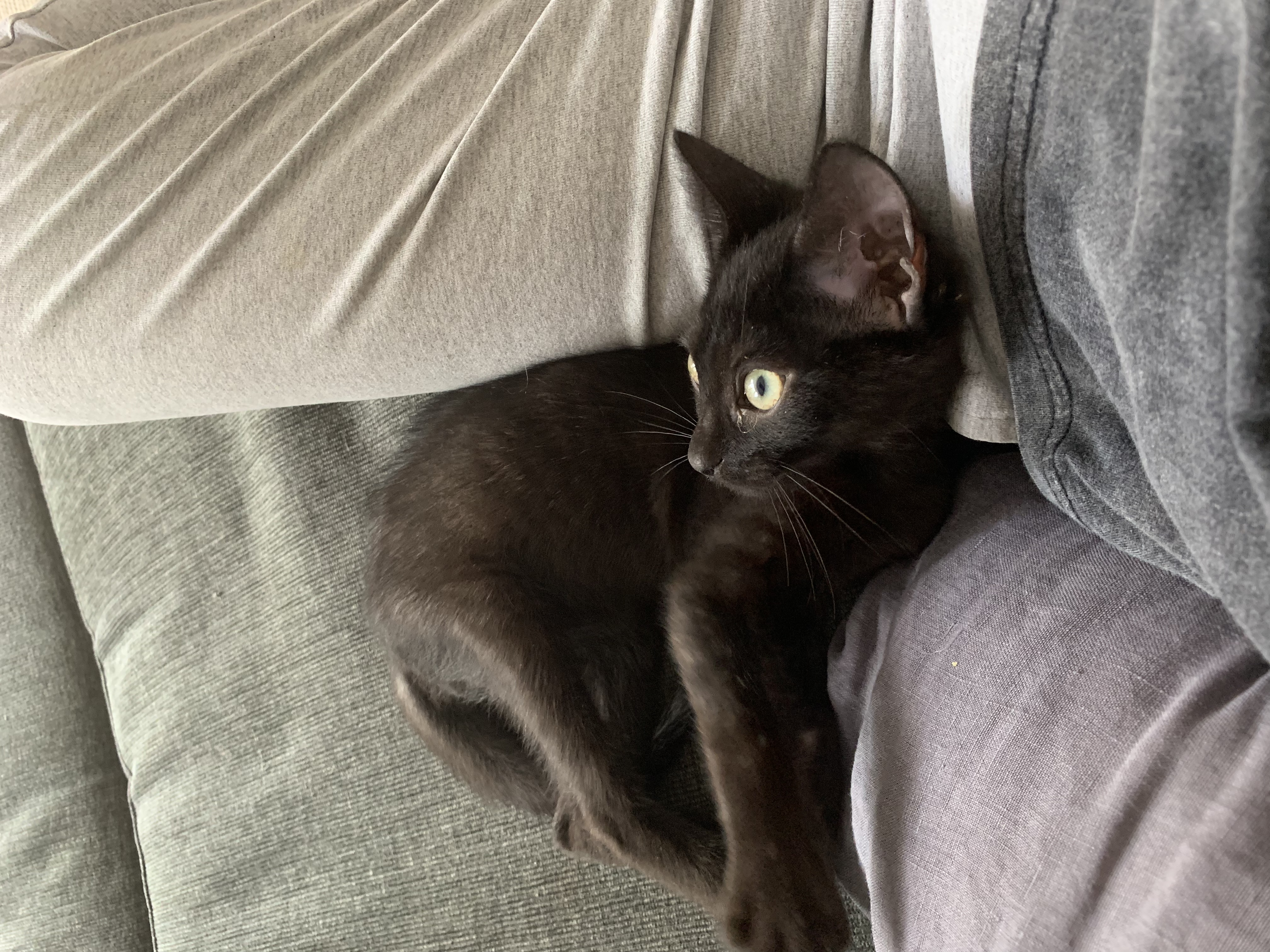 Pea is a long legged 10 week old black kitten who loves to sprint and stretch his legs. He is very cuddly and never misses an opportunity to sit on your knee for a cuddle.